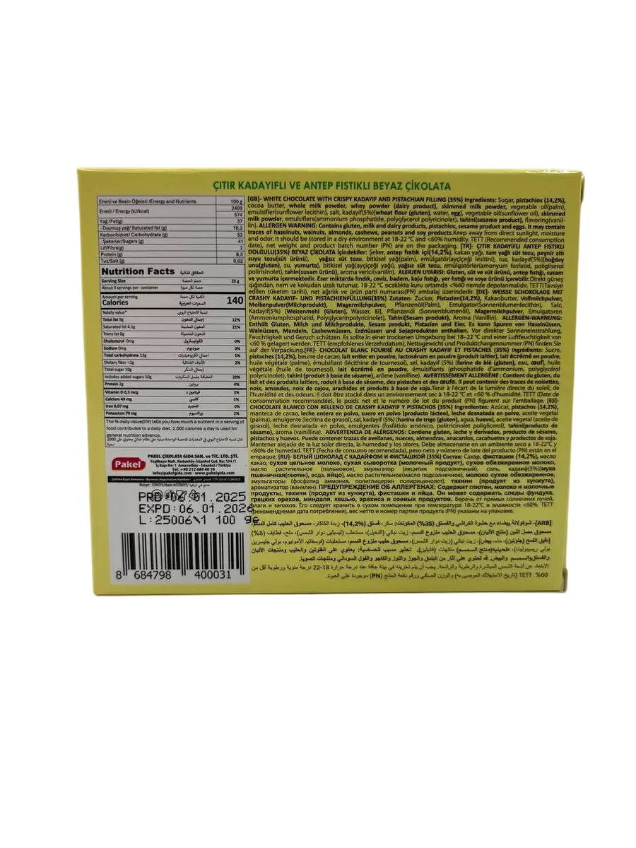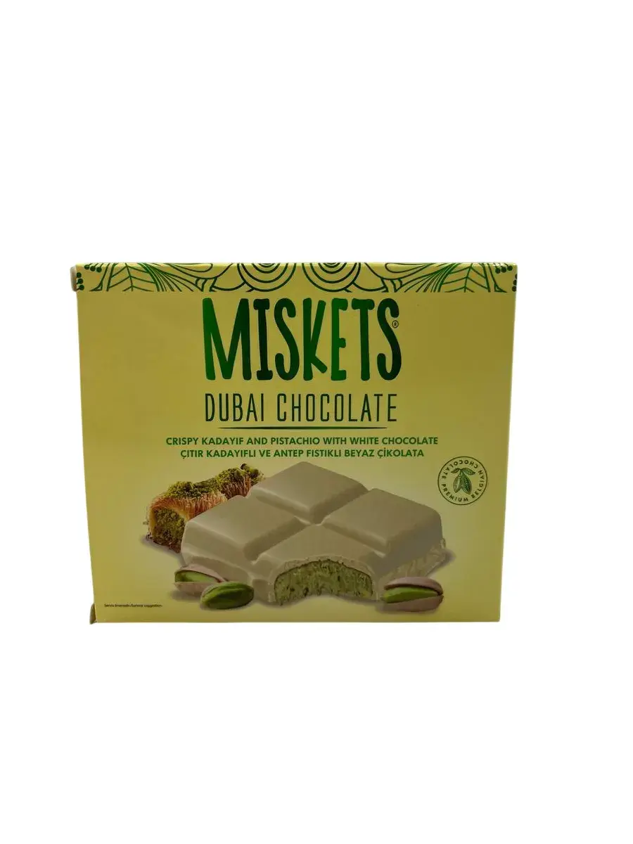 Побалуйте себя изысканным вкусом восточных сладостей с шоколадом Miskets. Этот уникальный десерт сочетает в себе нежный молочный шоколад с ароматной фисташковой начинкой и хрустящим кадаифом, покрытым белым шоколадом. Плитка весом 100 грамм – это идеальный баланс сладости, орехового аромата и приятной текстуры. Шоколад Miskets станет прекрасным дополнением к чашечке чая или кофе, а также оригинальным подарком для ценителей восточных деликатесов.