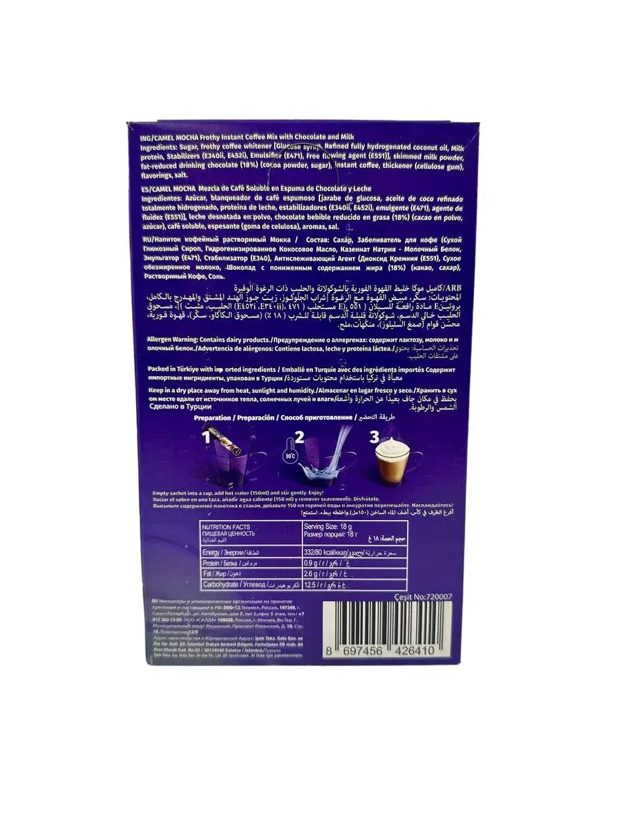 Вдохновленные классическим Camel Mocha, мы создали этот мягкий шоколадный напиток, который вы можете приготовить дома. Мы смешали наши высококачественные кофейные зерна 100% Арабика с полуобезжиренным молоком и нашим восхитительным ароматом какао и увенчали его мягкой приятной пеной. Насыпьте одну пачку в кружку. Добавьте 180 мл горячей воды, но подождите 30 секунд, прежде чем наливать кипящую воду, потому что идеальная температура воды должна быть 85°С. Хорошо перемешайте и наслаждайтесь кофе. В коробке 24 шт по 18г
