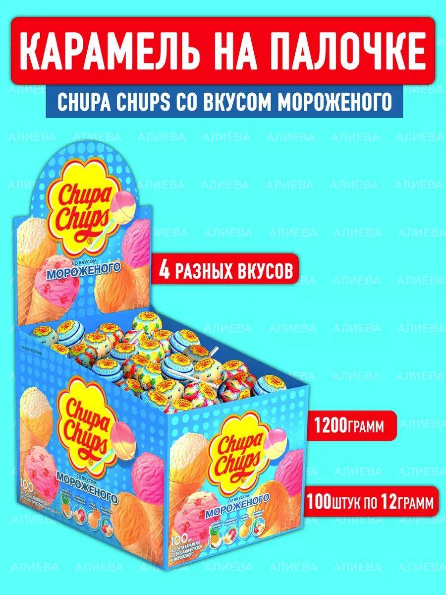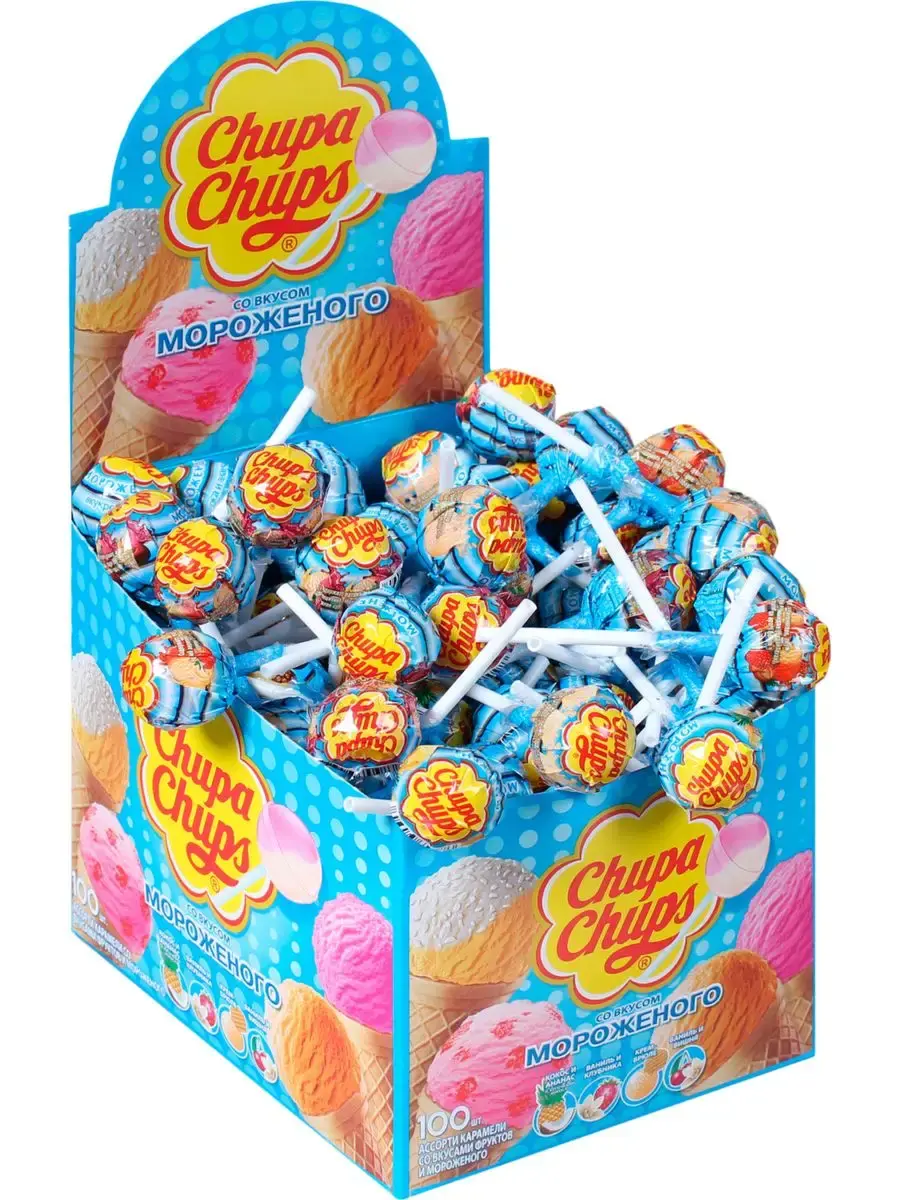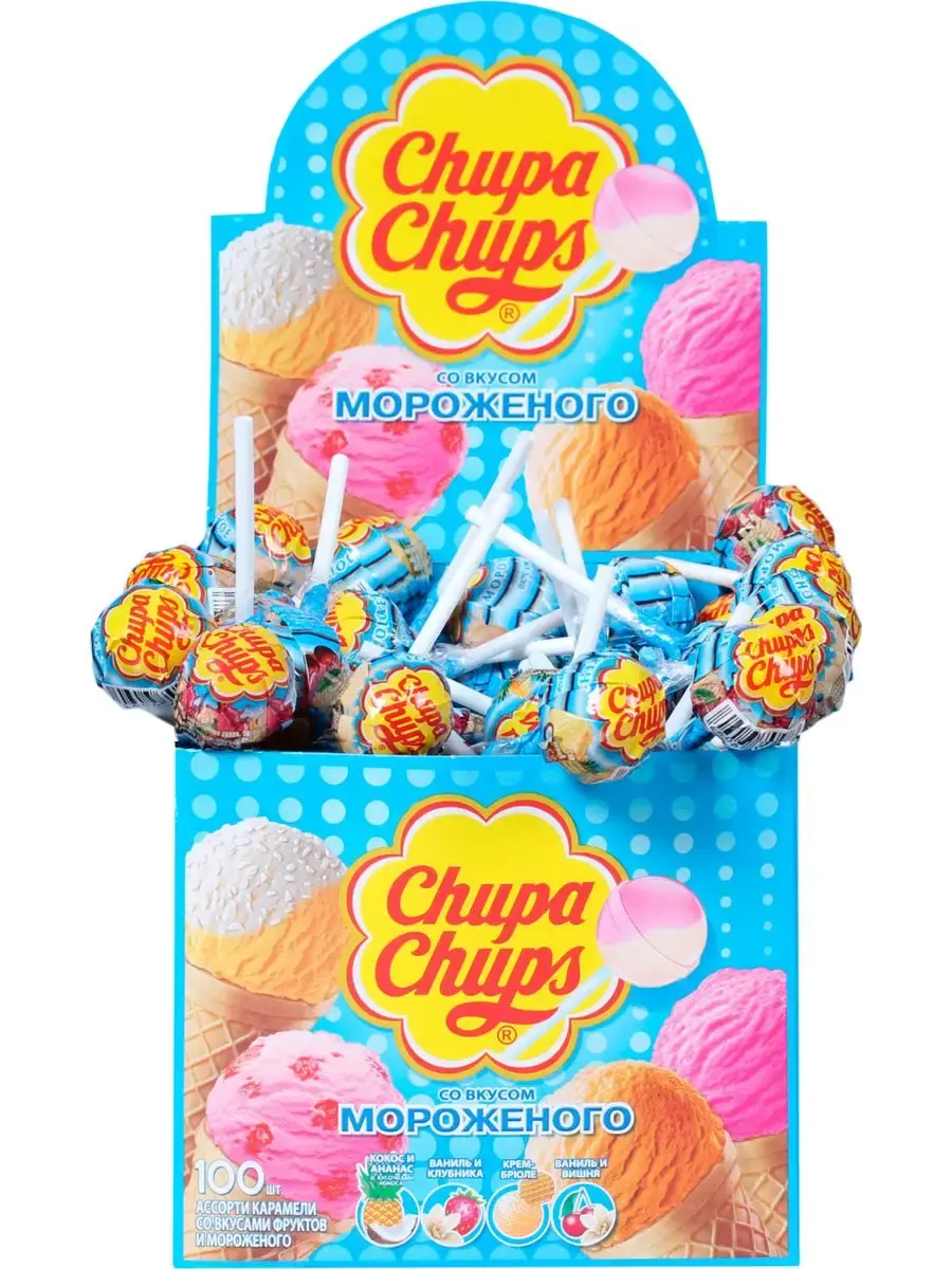 Никаких компромиссов между мороженым и леденцами! Отныне можно наслаждаться обоими в одном замечательном лакомстве. Представляем вам коробку ассорти Chupa Chups со 100 леденцами на палочке, каждый из которых поражает своим неповторимым вкусом мороженого.