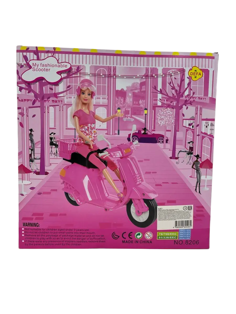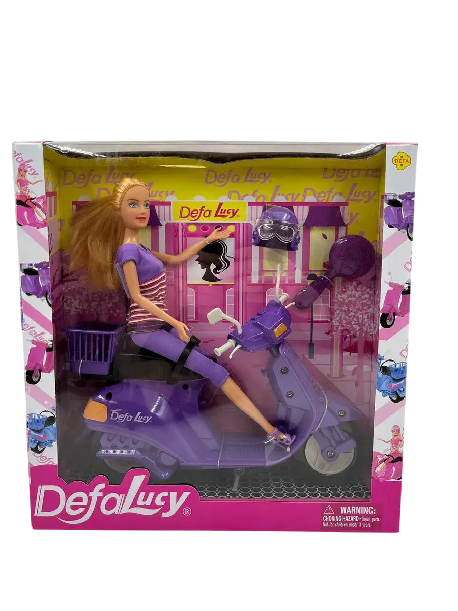 Красотка Люси собирается на прогулку. Да не просто пешую прогулку, а на своем крутом скутере и приглашает Вашу девочку прокатиться вместе с ней! Не волнуйтесь, ведь у красавицы есть защитный шлем, а в корзинку-багажник можно положить все самое необходимое для пикника. Скутер яркого цвета привлечет внимание окружающих, особенно когда за рулем красотка-блонди Люси. Переднее колесо скутера не поворачивается, однако руль можно крутить спокойно. Корзинка, расположенная сзади, при желании открепляется. Колеса скутера крутятся. Сама Люси - блондинка, у нее сверкающие длинные волосы и при желании ей можно создавать дивные образы и создавать прически. Одета она в симпатичный костюмчик и туфли на высоком каблуке. Руки и ноги куклы подвижны.