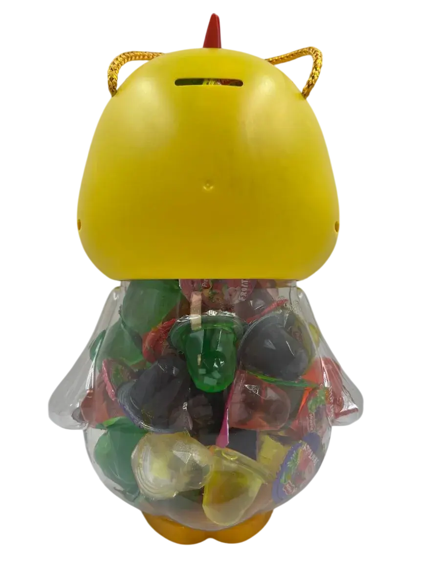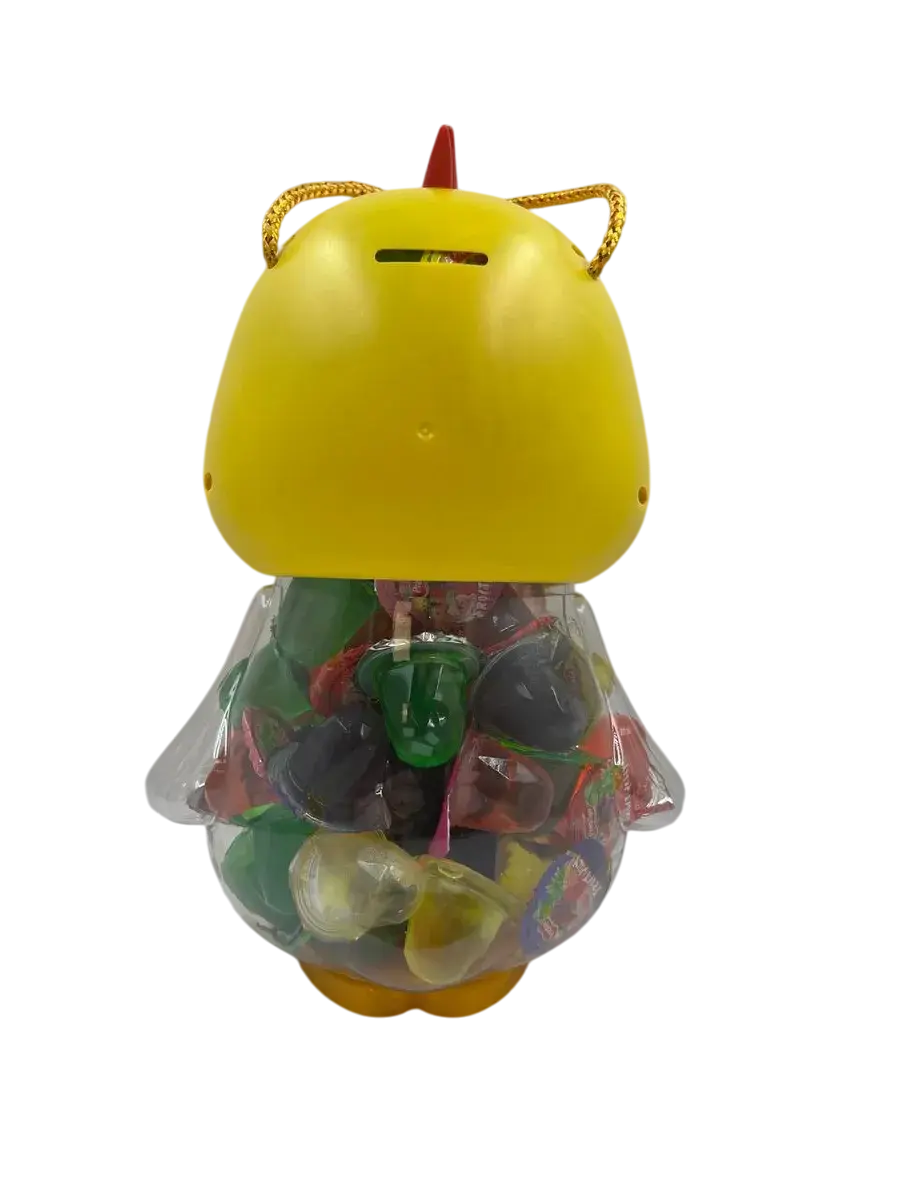 Десерт желейный в банке в форме цыпленка- нежное фруктовое желе с небольшим количеством фруктового сока в копилке. Каждая мини желейка находится в индивидуальной упаковке. Фруктовое желе похоже на фигурный сладкий или кислый, фруктовый или ягодный мармелад, джем или пудинг. Яркий красочный дизайн поднимет настроение, а микс вкусов клубники, яблока, апельсина, манго, персика и винограда придтся вам и вашим детям по душе.