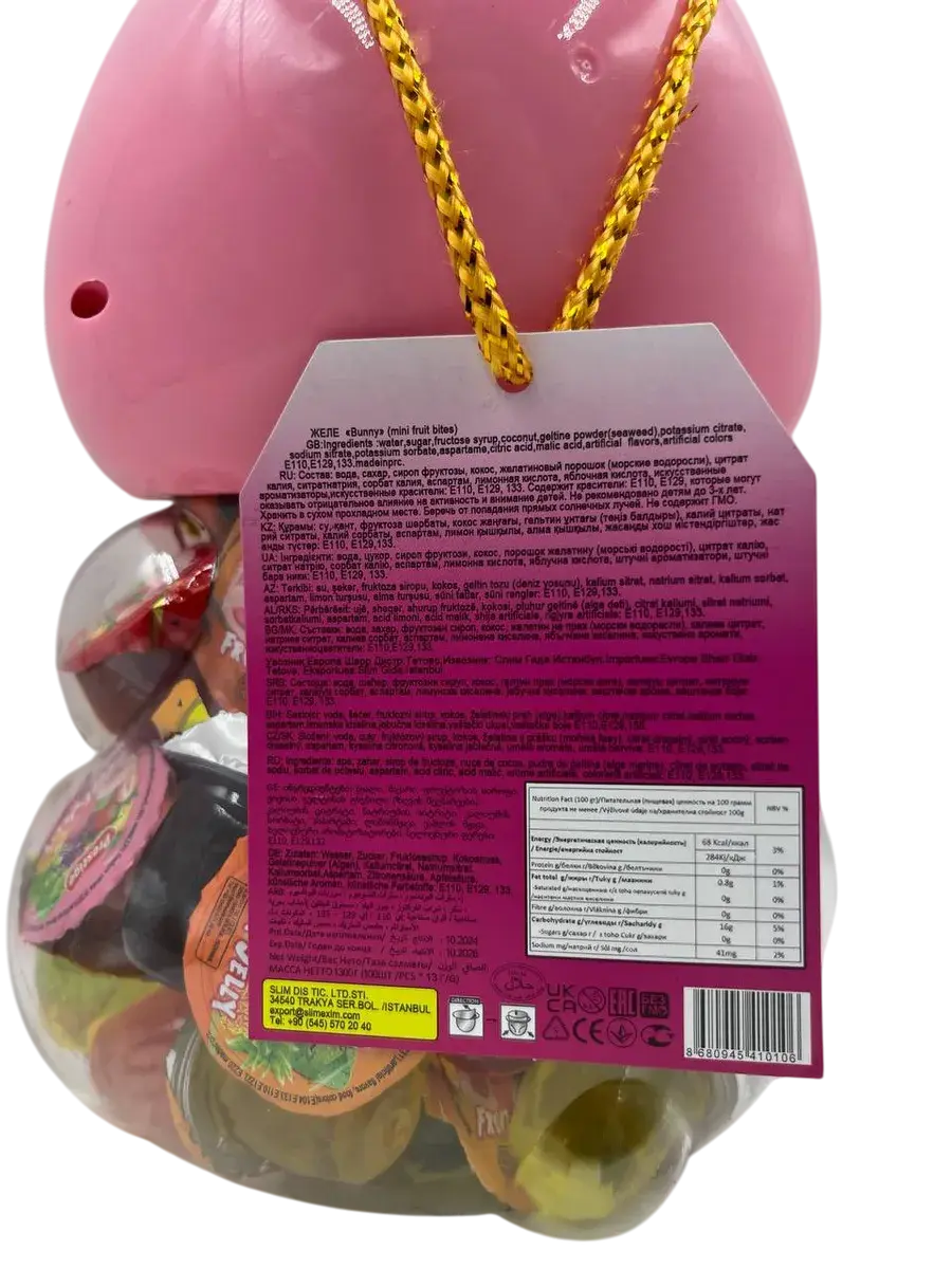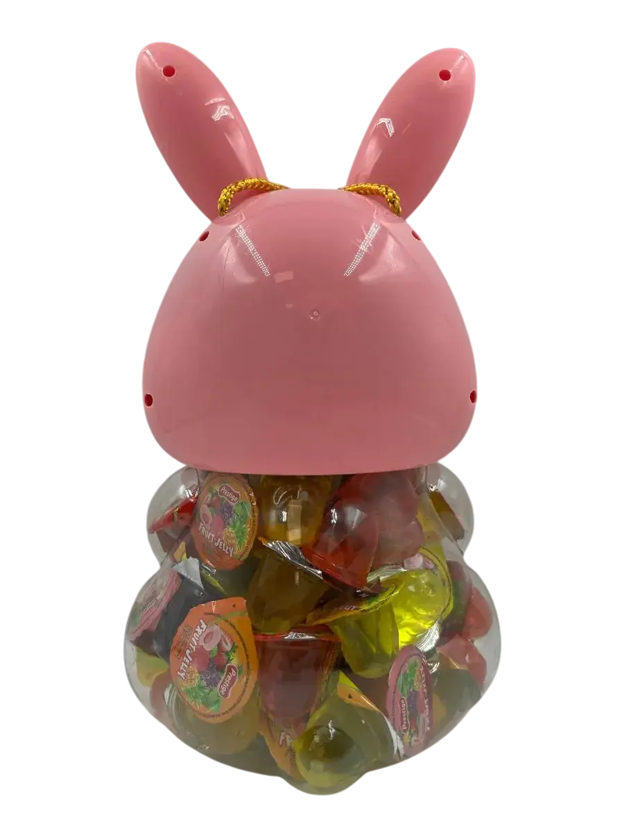 Десерт желейный в банке- копилке в форме кролика - нежное фруктовое желе с небольшим количеством фруктового сока в копилке. Каждая мини желейка находится в индивидуальной упаковке. Фруктовое желе похоже на фигурный сладкий или кислый, фруктовый или ягодный мармелад, джем или пудинг. Яркий красочный дизайн поднимет настроение, а микс вкусов клубники, яблока, апельсина, манго, персика и винограда придтся вам и вашим детям по душе.