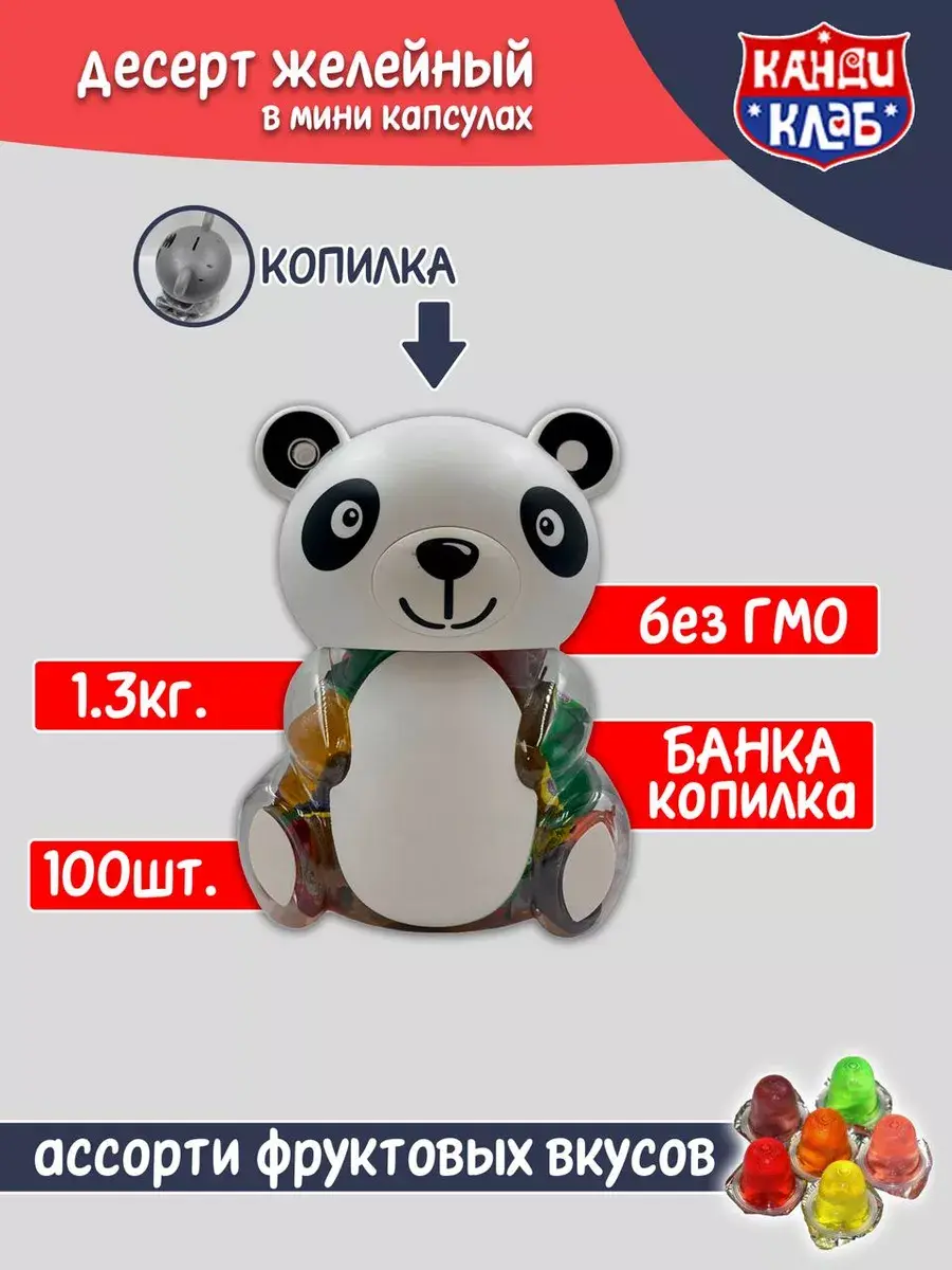 Десерт желейный в банке в форме Панды - нежное фруктовое желе с небольшим количеством фруктового сока в копилке. Каждая мини желейка находится в индивидуальной упаковке. Фруктовое желе похоже на фигурный сладкий или кислый, фруктовый или ягодный мармелад, джем или пудинг. Яркий красочный дизайн поднимет настроение, а микс вкусов клубники, яблока, апельсина, манго, персика и винограда придтся вам и вашим детям по душе.