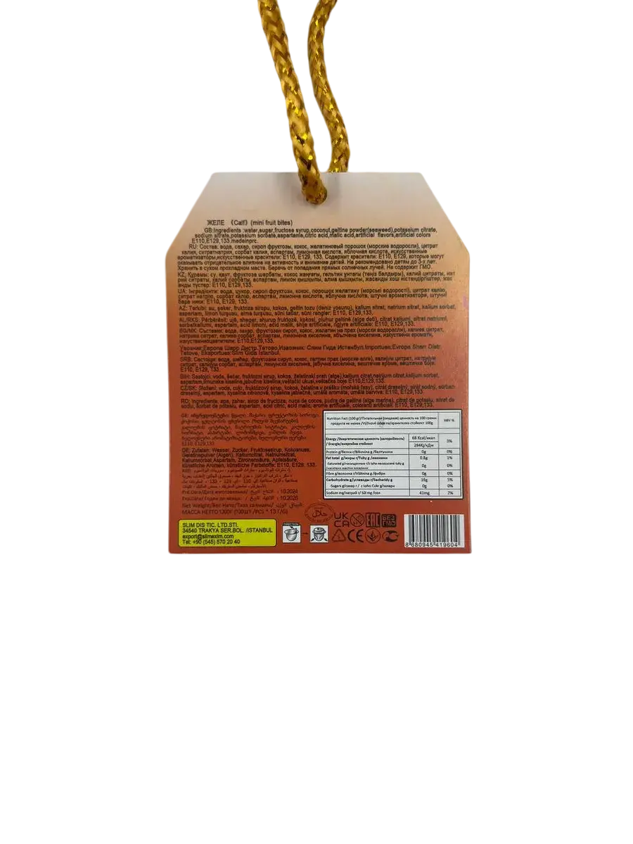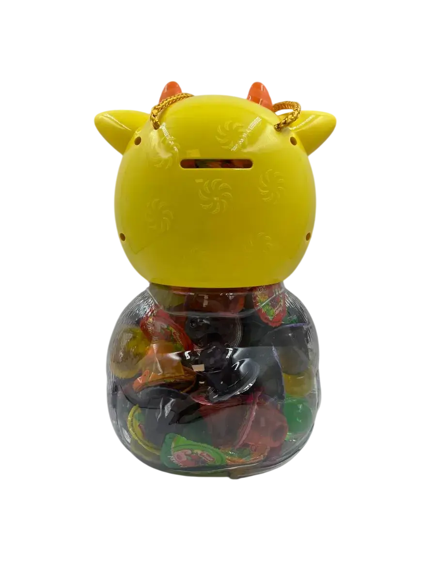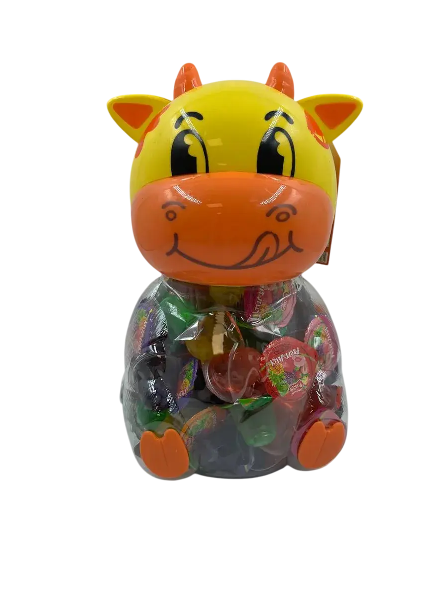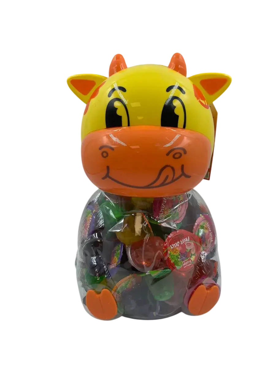 Десерт желейный в банке в форме коровы - нежное фруктовое желе с небольшим количеством фруктового сока в копилке. Каждая мини желейка находится в индивидуальной упаковке. Фруктовое желе похоже на фигурный сладкий или кислый, фруктовый или ягодный мармелад, джем или пудинг. Яркий красочный дизайн поднимет настроение, а микс вкусов клубники, яблока, апельсина, манго, персика и винограда придтся вам и вашим детям по душе.