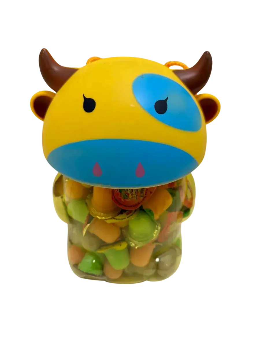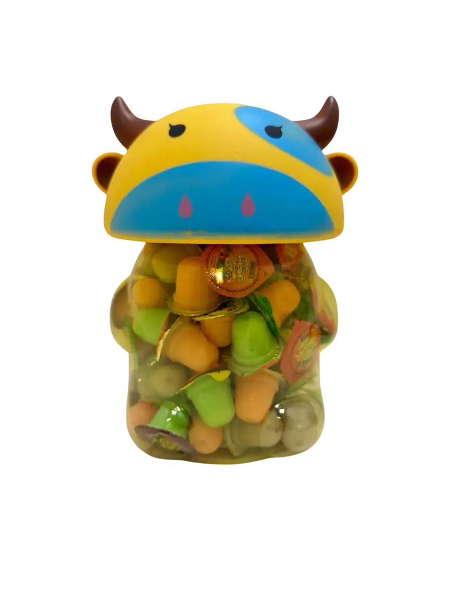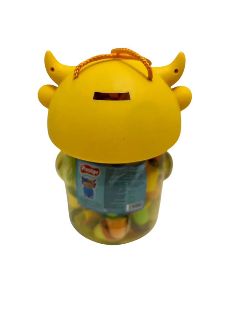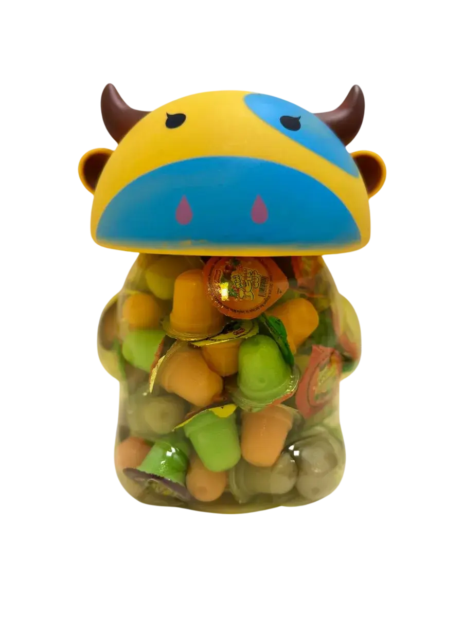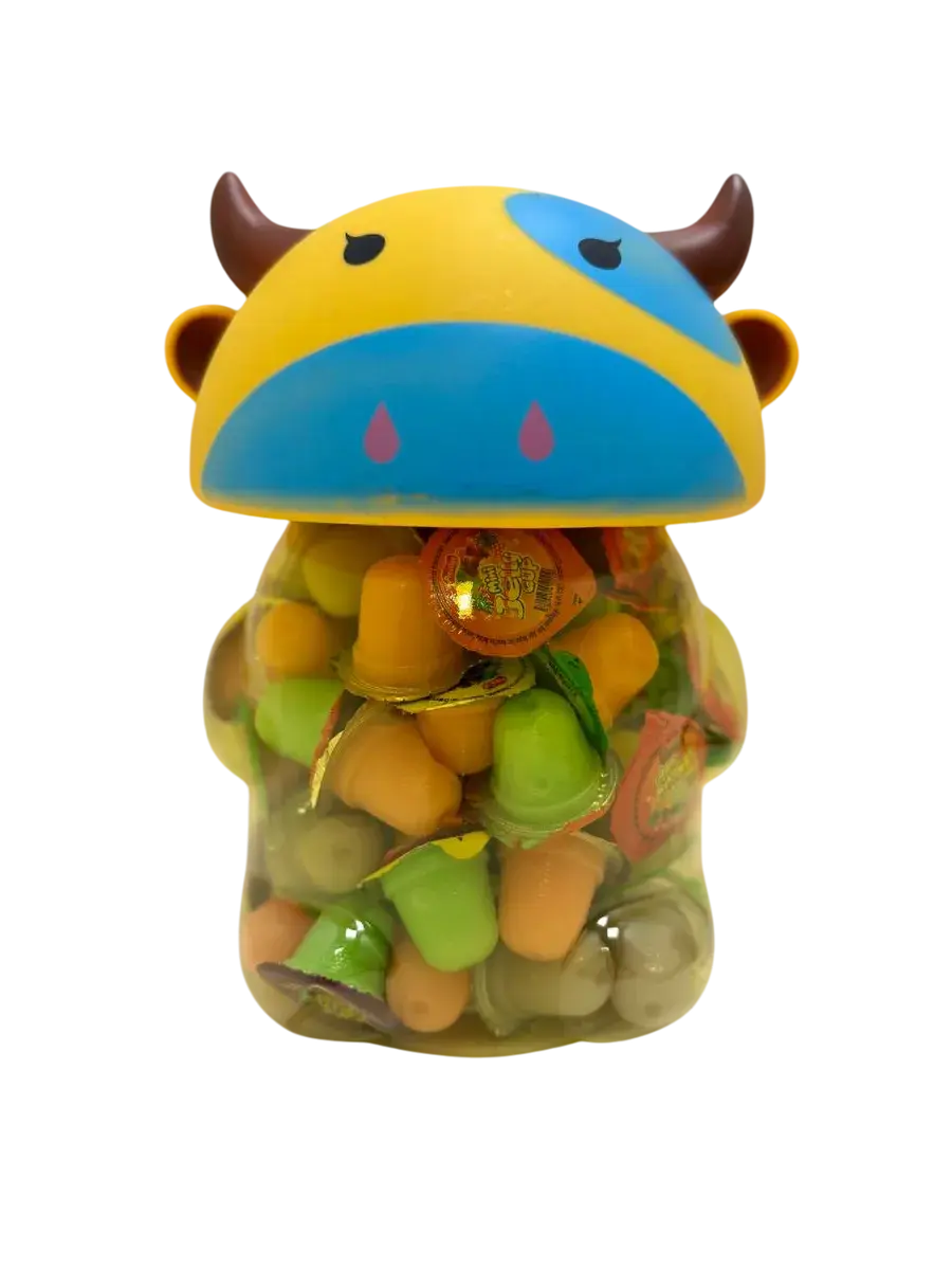 Десерт желейный в банке в форме быка- нежное фруктовое желе с небольшим количеством фруктового сока в копилке. Каждая мини желейка находится в индивидуальной упаковке. Фруктовое желе похоже на фигурный сладкий или кислый, фруктовый или ягодный мармелад, джем или пудинг. Яркий красочный дизайн поднимет настроение, а микс вкусов клубники, яблока, апельсина, манго, персика и винограда придтся вам и вашим детям по душе.