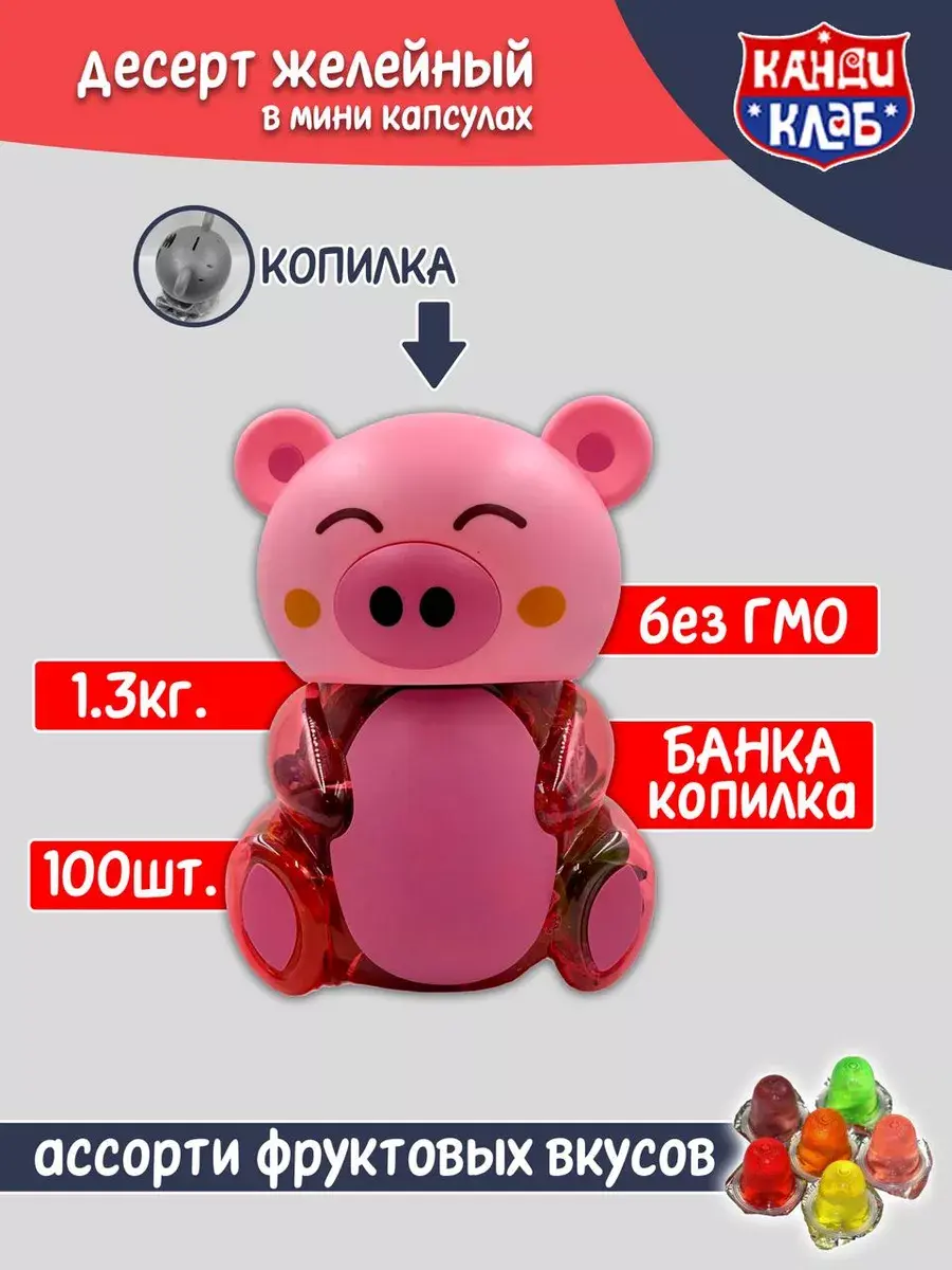 Десерт желейный в банке- копилке в форме поросенка - нежное фруктовое желе с небольшим количеством фруктового сока в копилке. Каждая мини желейка находится в индивидуальной упаковке. Фруктовое желе похоже на фигурный сладкий или кислый, фруктовый или ягодный мармелад, джем или пудинг. Яркий красочный дизайн поднимет настроение, а микс вкусов клубники, яблока, апельсина, манго, персика и винограда придтся вам и вашим детям по душе.