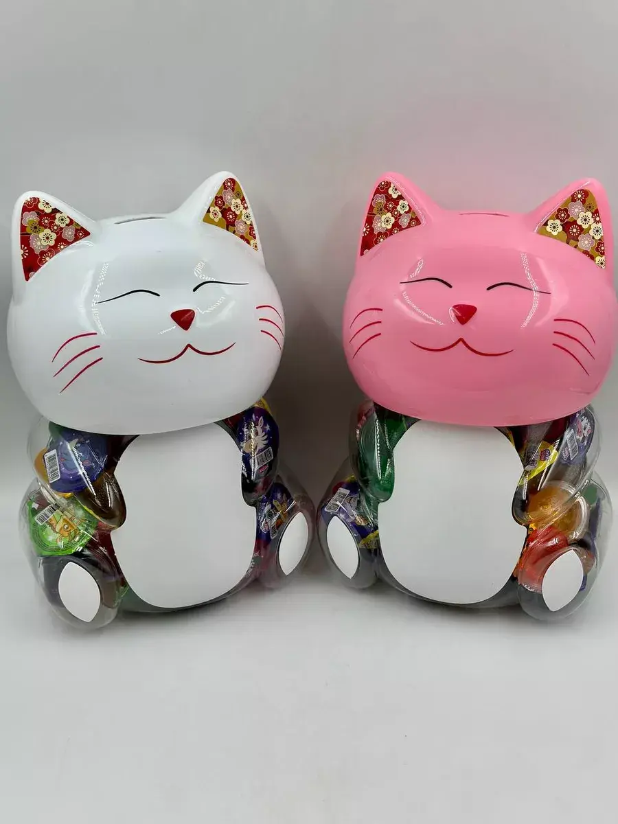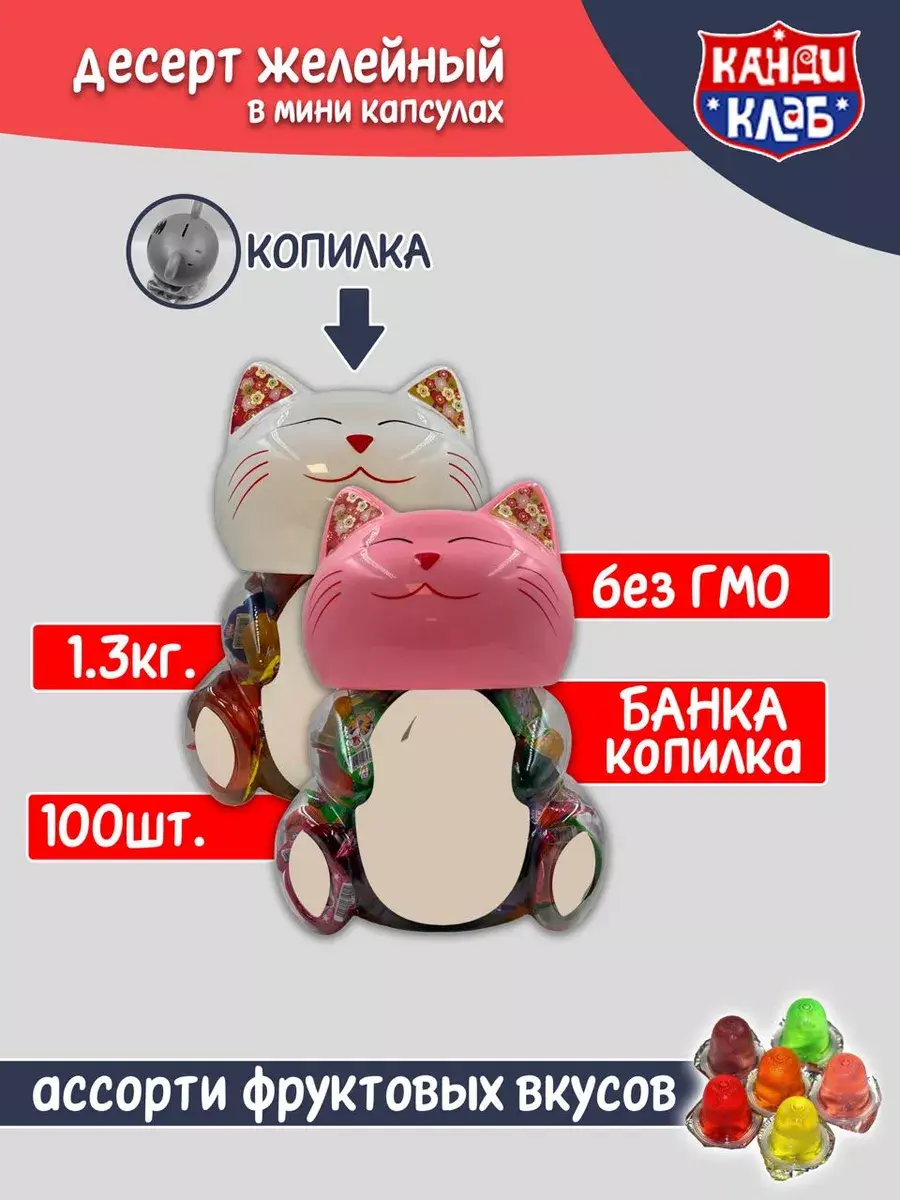 Десерт желейный в банке в форме кошки - нежное фруктовое желе с небольшим количеством фруктового сока в копилке. Каждая мини желейка находится в индивидуальной упаковке. Фруктовое желе похоже на фигурный сладкий или кислый, фруктовый или ягодный мармелад, джем или пудинг. Яркий красочный дизайн поднимет настроение, а микс вкусов клубники, яблока, апельсина, манго, персика и винограда придтся вам и вашим детям по душе.