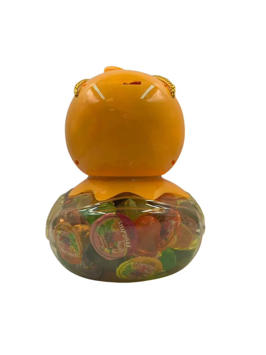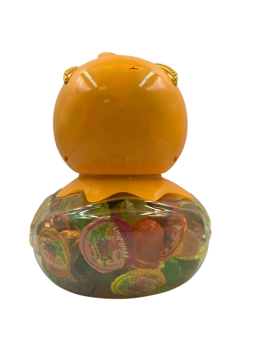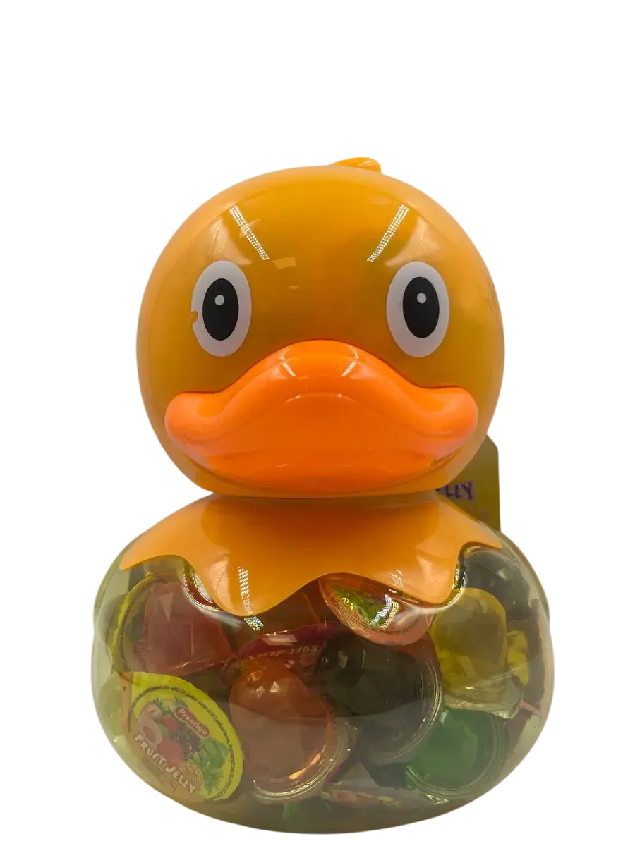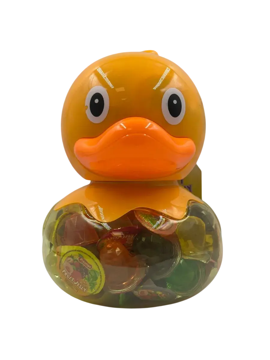Десерт желейный в банке- копилке в форме утки - нежное фруктовое желе с небольшим количеством фруктового сока в копилке. Каждая мини желейка находится в индивидуальной упаковке. Фруктовое желе похоже на фигурный сладкий или кислый, фруктовый или ягодный мармелад, джем или пудинг. Яркий красочный дизайн поднимет настроение, а микс вкусов клубники, яблока, апельсина, манго, персика и винограда придтся вам и вашим детям по душе.