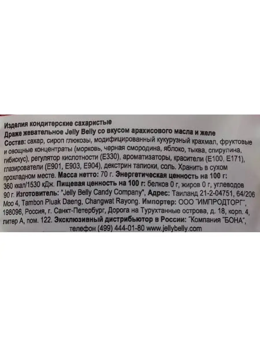 Тост с арахисовым маслом и желе -популярное блюдо в американской культуре. Как гласит легенда, это блюдо придумали солдаты Второй мировой. Они смешали арахисовое масло, желе и хлеб из своих пайков и получили настоящую калорийную бомбу. Во времена войны такие блюда были на вес золота - быстро и очень питательно. Существует даже день арахисового масла и желе - он отмечается по всему миру 2 апреля. Если вы никогда не пробовали этот гастрономический изыск - попробуйте его в формате жевательного драже от "Jelly Belly". Меньше калорий, больше вкуса!Состав: сахар, сироп глюкозы, модифицированный кукурузный крахмал, ароматизаторы, краситель (Е100, Е171), покрытие (Е901, Е903, Е904), соль, концентраты (яблоко, морковь).