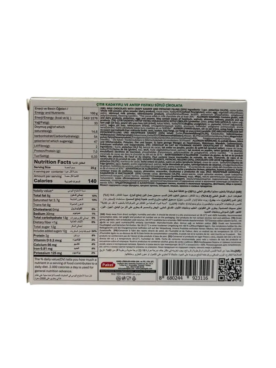 Вместе эти высококачественные ингредиенты создают шедевр вкуса и текстуры, отражая суть турецкого кондитерского искусства. Изготовлен из высококачественного какао, этот шоколад идеально дополняет ореховые и сливочные нотки кадаифа и фисташек. Его насыщенный вкус и шелковистая текстура подчеркивают гармонию ингредиентов, создавая изысканное наслаждение.Элегантная упаковка делает этот шоколад отличным подарком для близких, особенно в праздничные дни, на свадьбы или другие особые события.