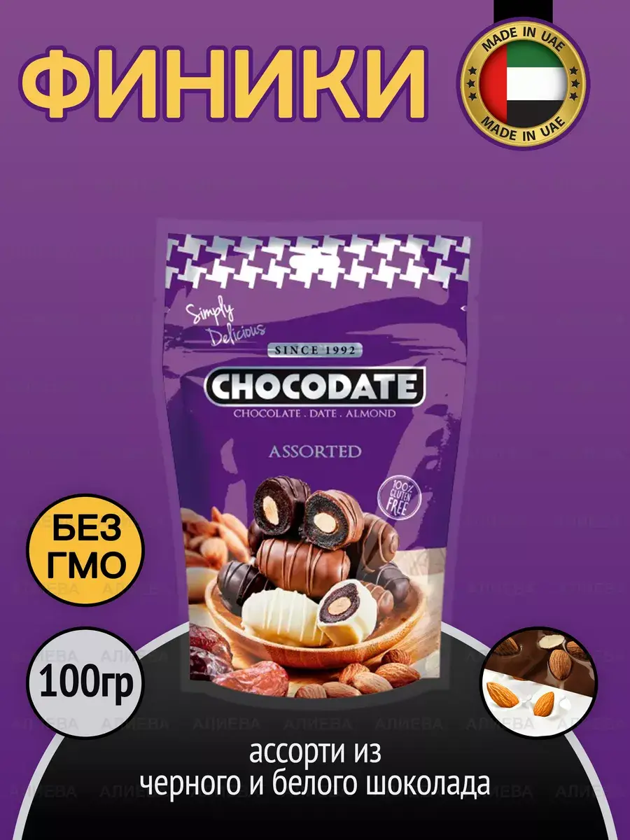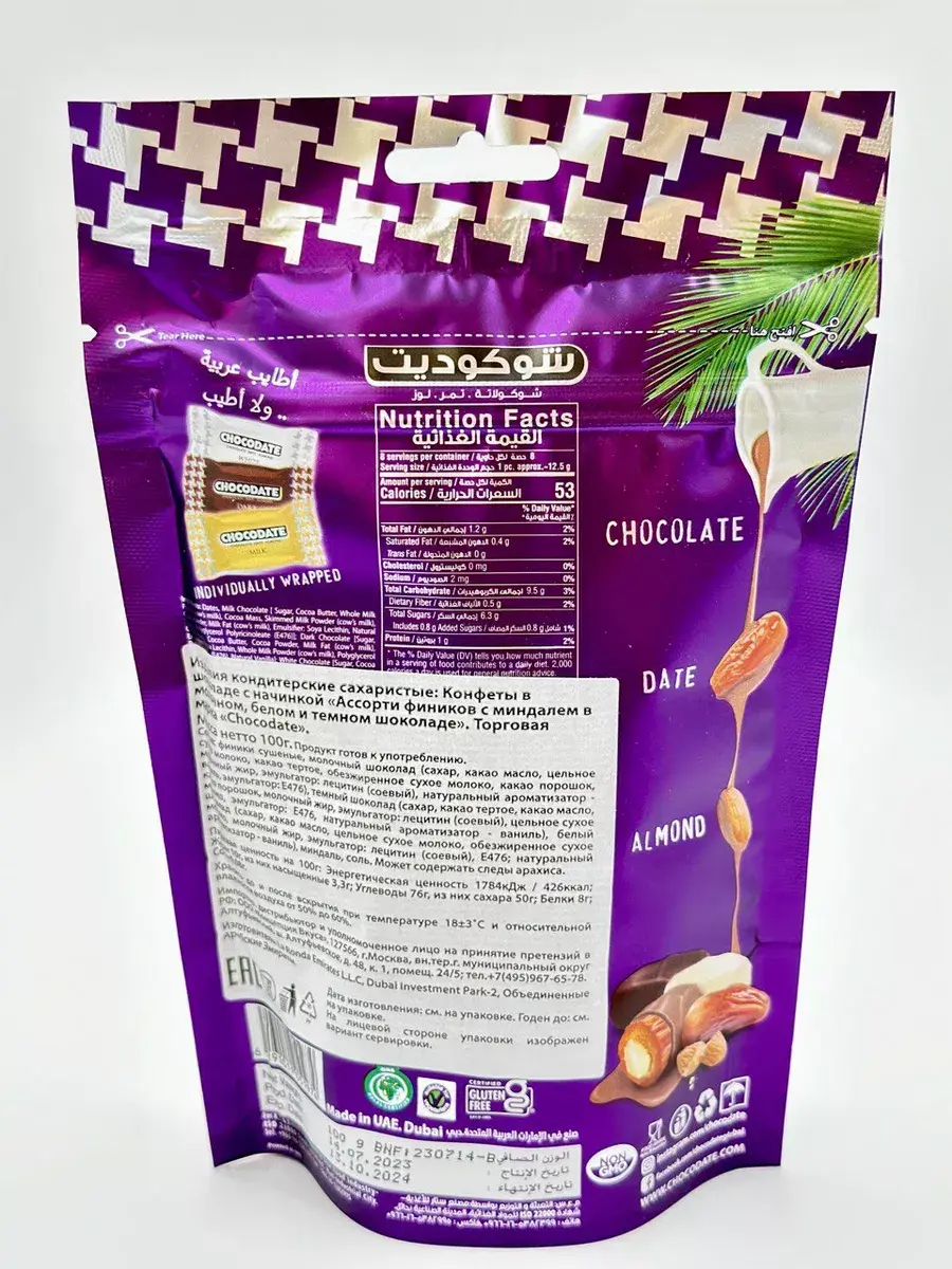 Chocodate – вкусная и полезная альтернатива классическим шоколадным конфетам. Цельное ядро калифорнийского миндаля в нежном финике из Саудовской Аравии, теперь с тремя видами шоколада в одной упаковке: молочным бельгийским шоколадом, темным шоколадом и белым. Каждая конфета изготавливается вручную. Богатые клетчаткой и витаминами, конфеты зарядят вас энергией и хорошим настроением. Попробуйте этот идеальный союз натуральных ингредиентов и нежнейшего шоколада в каждом укусе!