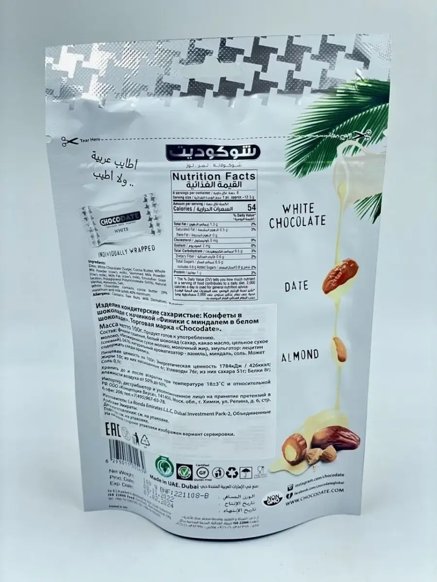 финики сушеные, белый шоколад (сахар, какао масло, цельное сухое молоко,