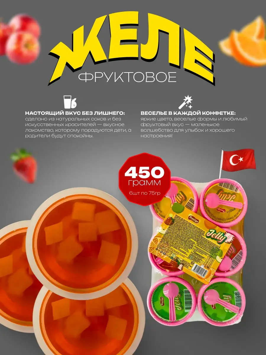 Фруктовое желе Prestige с кусочками натуральных фруктов – вкусное и полезное лакомство для всей семьи. Турецкий производитель предлагает нежное желе в удобных формочках с сочными кусочками клубники, яблока и апельсина. В каждой упаковке – 6 порций по 75 грамм, идеально подходящих для легкого перекуса, десерта или украшения стола. Натуральные ингредиенты и яркие вкусы делают это желе от Prestige отличным выбором для тех, кто ценит качество и наслаждается свежими фруктовыми нотками. Попробуйте настоящее удовольствие с желе Prestige – сочное, ароматное и полное витаминов.