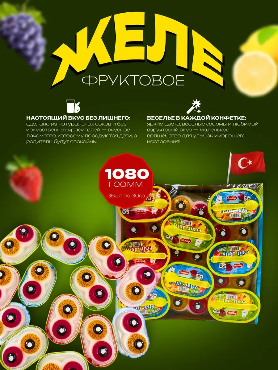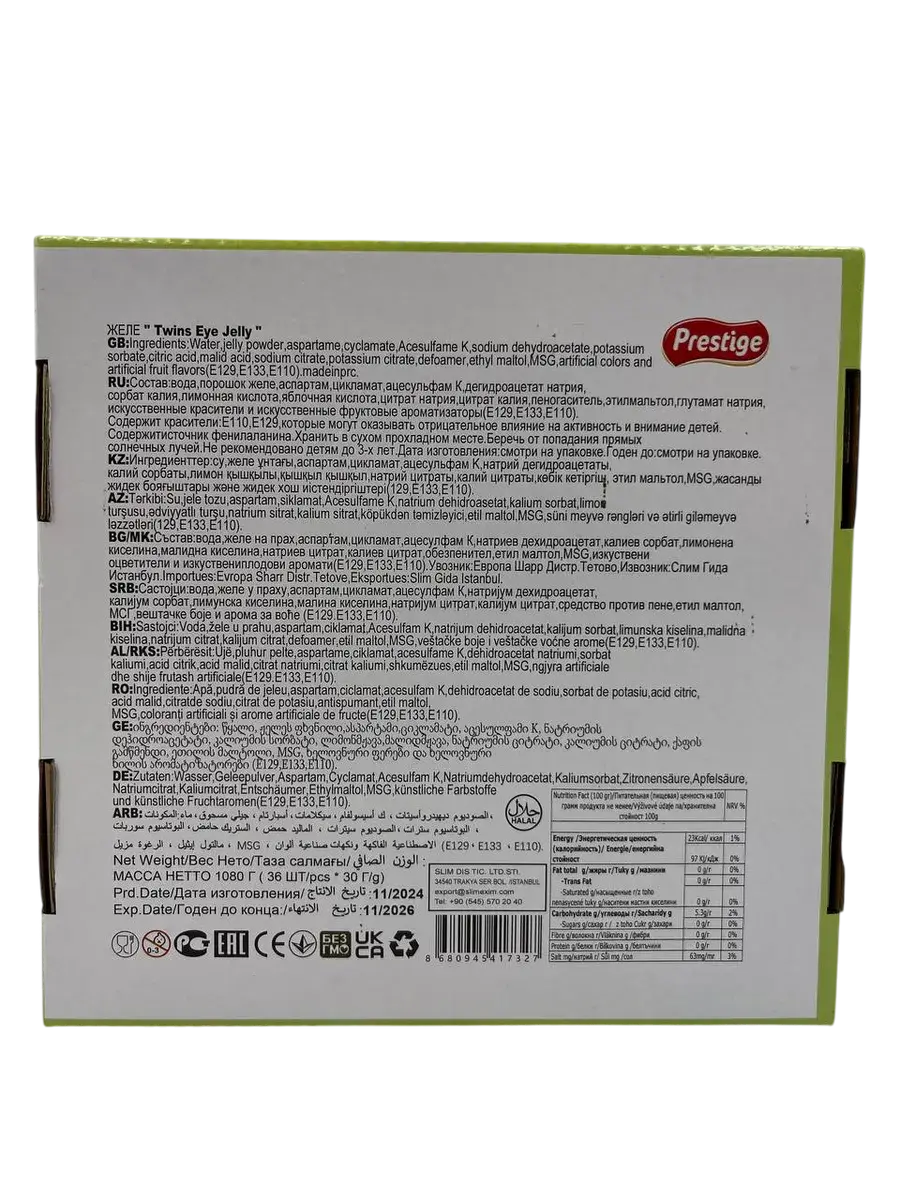 Турецкий производитель Prestige представляет необычное фруктовое желе в форме глаза, которое удивит и порадует любителей оригинальных сладостей. В каждой упаковке вас ждет 36ипорций желе по 30 грамм каждая, упакованных в индивидуальные контейнеры для удобного использования.