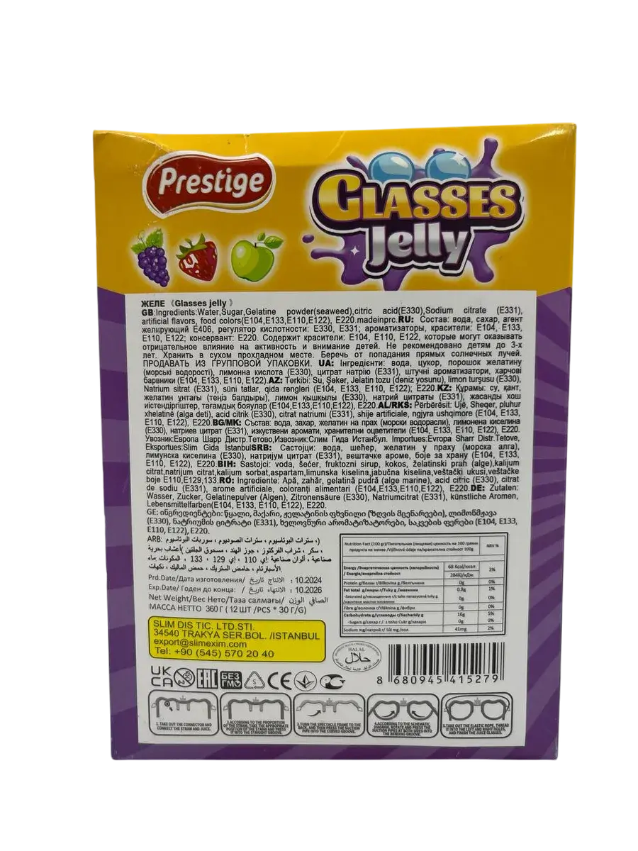 Турецкий бренд Prestige представляет уникальное желейное лакомство в форме настоящих очков – 12 ярких порций по 30 граммов в каждой упаковке. Каждая пара "очков" упакована индивидуально, сохраняя сочность и свежесть трех популярных вкусов: сладкой клубники, освежающего зеленого яблока и ароматного винограда.