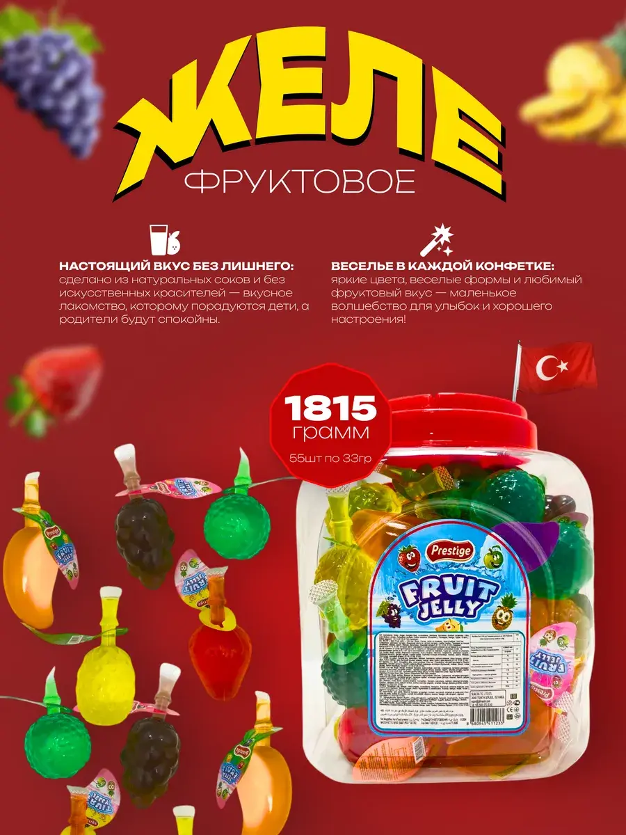 Окунитесь в сочный мир натуральных вкусов вместе с желейными конфетами от турецкого производителя Prestige, который создает неповторимые сладости для всей семьи. Эти восхитительные желейные конфеты выполнены в форме разнообразных фруктов и ягод, что делает каждую конфету узнаваемой и особенно привлекательной для детей, превращая обычное лакомство в маленькое фруктовое приключение. Нежные желейные конфеты обладают насыщенным и натуральным вкусом спелых плодов, среди которых вы найдете сладкий виноград, ароматную клубнику, солнечный манго, сочное яблоко и экзотический ананас. Такое разнообразие вкусов позволяет каждый раз выбирать новое настроение и наслаждаться богатой палитрой sensations, созданной благодаря использованию качественных ингредиентов и внимательному отношению к рецептуре. Турецкий бренд Prestige зарекомендовал себя как производитель, который сочетает в своей продукции отменный вкус и доступность.