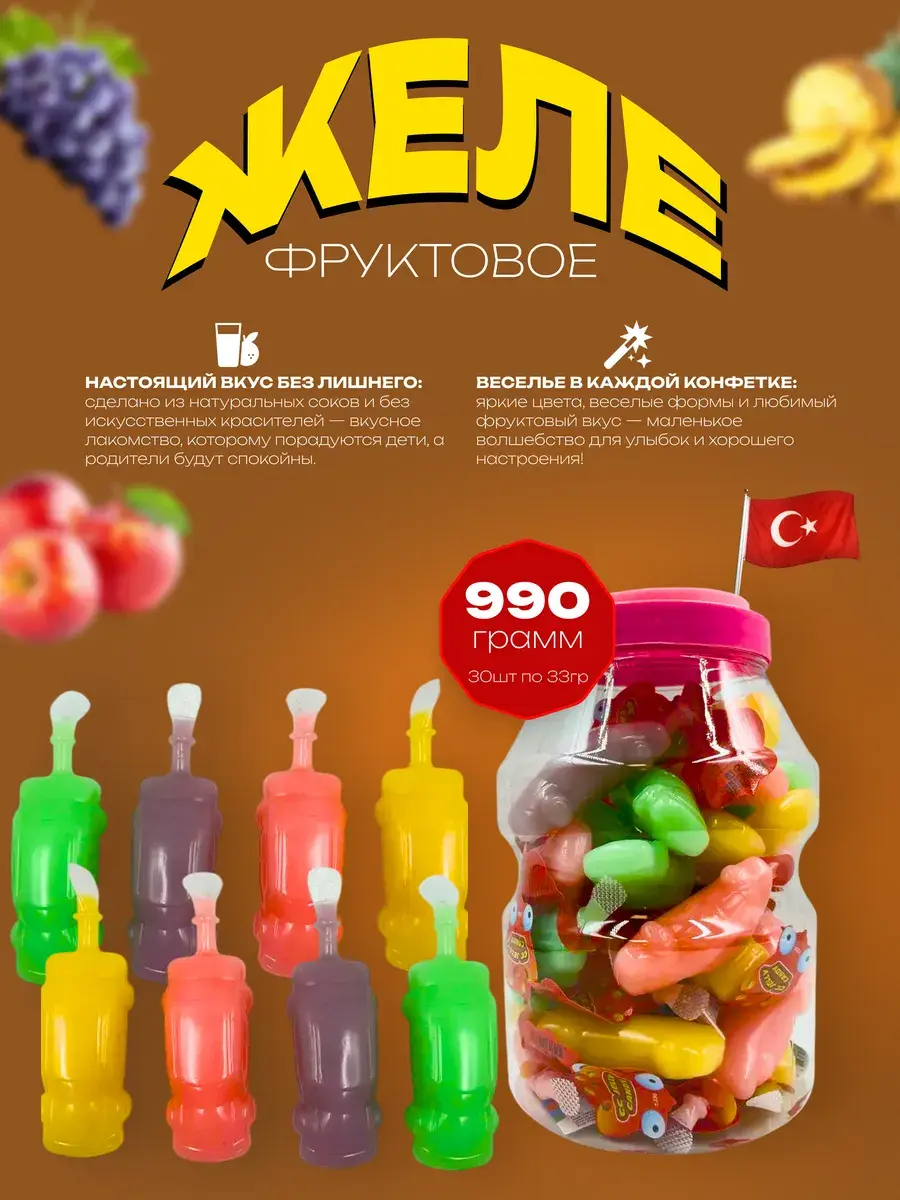 Продукт изготовлен с использованием натуральных ингредиентов и качественных фруктовых ароматизаторов, соответствующих международным стандартам безопасности. Эти милые желейные машинки не только порадуют детей вкусом, но и разовьют их фантазию, превращая процесс употребления в увлекательную игру.