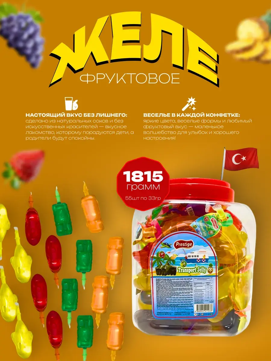 Отправляйтесь в увлекательное вкусное путешествие вместе с желейными конфетами от турецкого производителя Prestige, который создает уникальные сладости для детей и взрослых. Эти забавные желейные конфеты выполнены в форме разнообразных транспортных средств, среди которых вы найдете скоростной автомобиль, мощный корабль, стремительный самолет и грозный танк. Каждая конфета превращается в небольшой символ путешествия и приключений, пробуждая фантазию и интерес к исследованию мира. Нежные желейные конфеты обладают насыщенным и ярким фруктовым вкусом, включающим в себя сладкий виноград, ароматную клубнику, экзотическое манго, сочное яблоко и тропический ананас. Это разнообразие позволяет каждый раз открывать новые грани вкуса и наслаждаться богатой палитрой sensations, созданной благодаря тщательно подобранным ингредиентам и вниманию к качеству со стороны турецкого бренда Prestige.