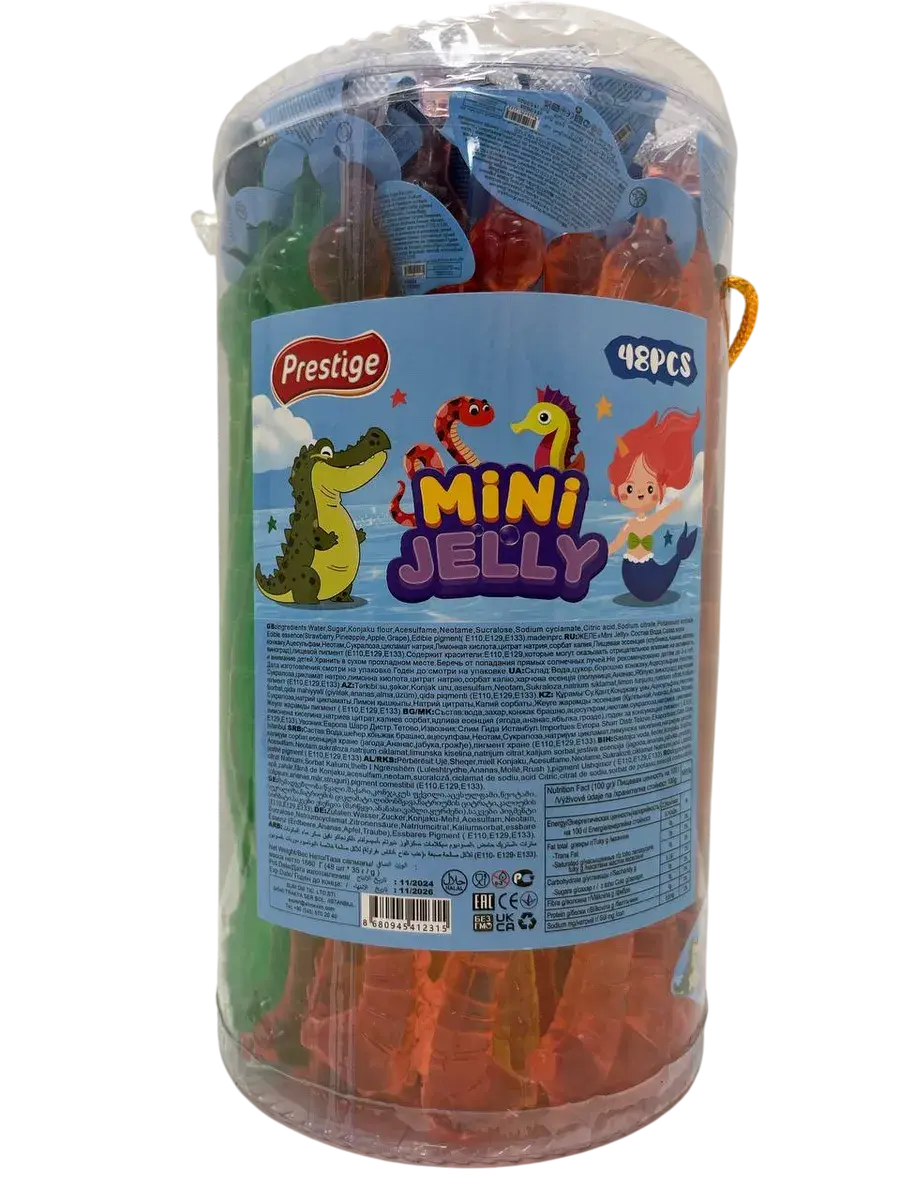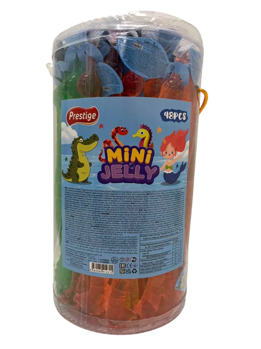 Турецкий производитель Prestige представляет фруктовое желейное ассорти в изящной форме морского конька, которое привносит элемент морского волшебства в мир желейных сладостей. В каждой банке вас ждет 48 желейных изделий весом по 35 грамм каждое, где утонченная форма гармонично сочетается с насыщенным вкусом. Продукция включает четыре классических фруктовых вкуса: сочную клубнику, тропический ананас, освежающее яблоко и ароматный виноград.