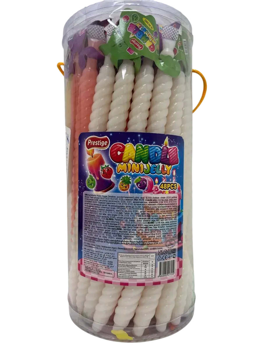 Турецкий производитель Prestige представляет фруктовое желейное ассорти в элегантной форме свечи, которое привносит атмосферу праздника в мир желейных сладостей. В каждой банке вас ждет 48 желейных изделий весом по 35 грамм каждое, где изысканная форма гармонично сочетается с насыщенным вкусом. Продукция включает четыре классических фруктовых вкуса: сочную клубнику, тропический ананас, освежающее яблоко и ароматный виноград.