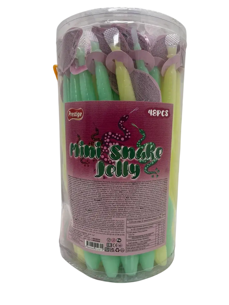 Турецкий производитель Prestige представляет фруктовое желейное ассорти в замысловатой форме змеи, которое переосмысливает идею желейных сладостей. В каждой банке вас ждет 48 желейных изделий весом по 35 грамм каждое, где искусная форма сочетается с интенсивным вкусом. Продукция раскрывает четыре классических фруктовых вкуса: сочную клубнику, тропический ананас, освежающее яблоко и ароматный виноград.