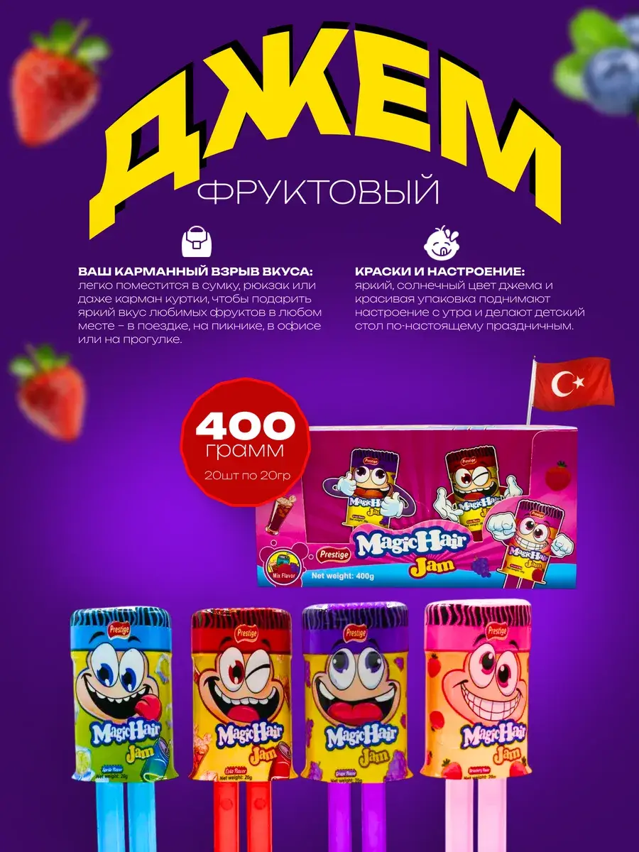 Турецкий бренд Prestige представляет оригинальный фруктовый джем в креативных упаковках в форме забавных человечков. Каждая 20-граммовая порция заключена в удобную индивидуальную упаковку, а в блоке вас ждет 20 таких веселых лакомств. Особенность этих джемов – интерактивный способ подачи: стоит надавить на ножки человечка, как вкусный джем потечет из его головы, превращая процесс употребления в увлекательную игру.