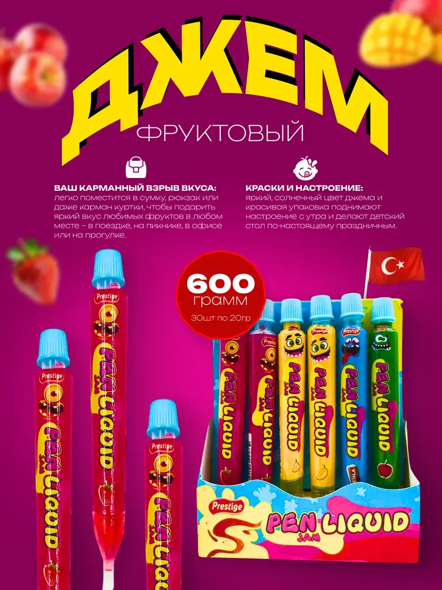 Турецкий бренд Prestige предлагает необычный фруктовый джем в инновационной упаковке, выполненной в форме удобной ручки. Каждая такая "ручка" содержит 20 грамм ароматного джема, а в блоке представлено 30 индивидуально упакованных порций. Оригинальный формат делает этот продукт идеальным решением для быстрого перекуса, полезного лакомства в дороге или необычного дополнения к завтраку.
