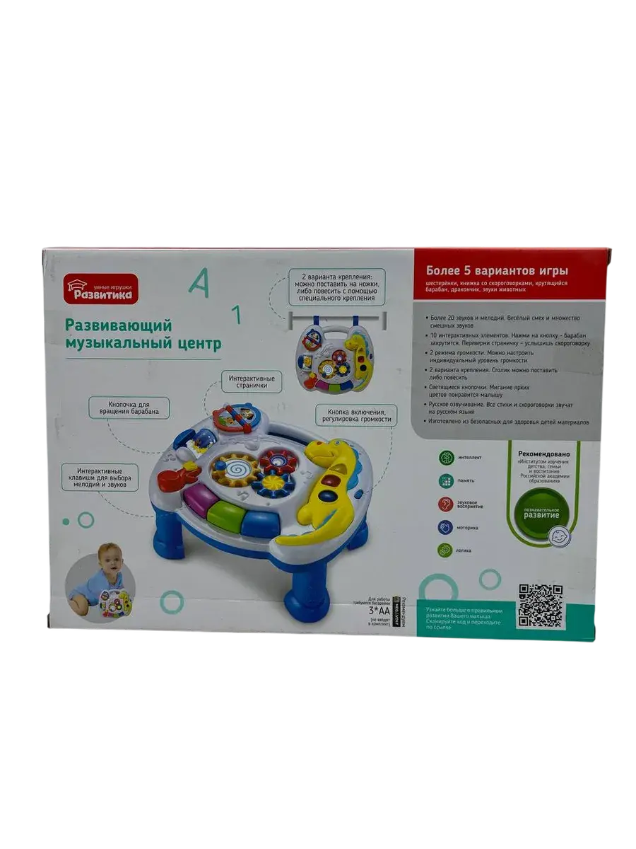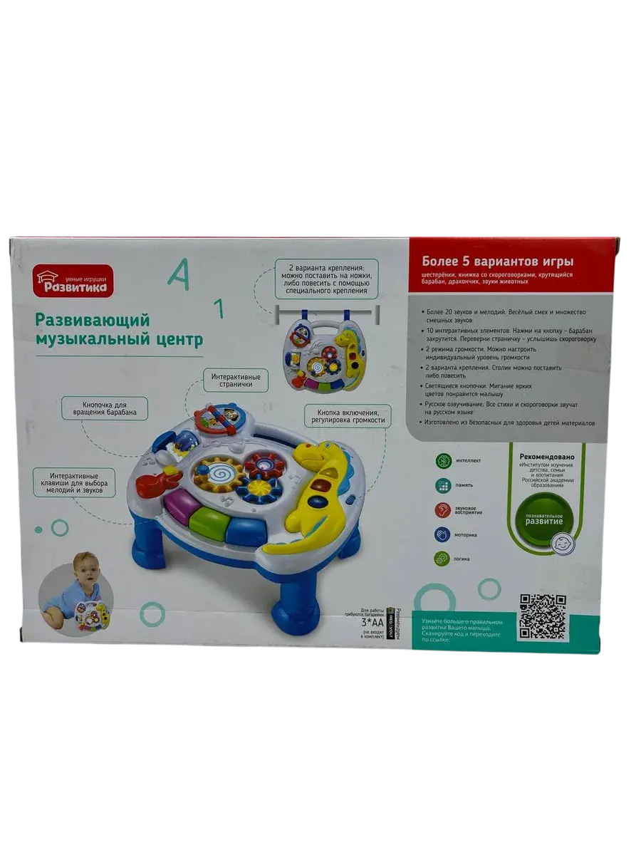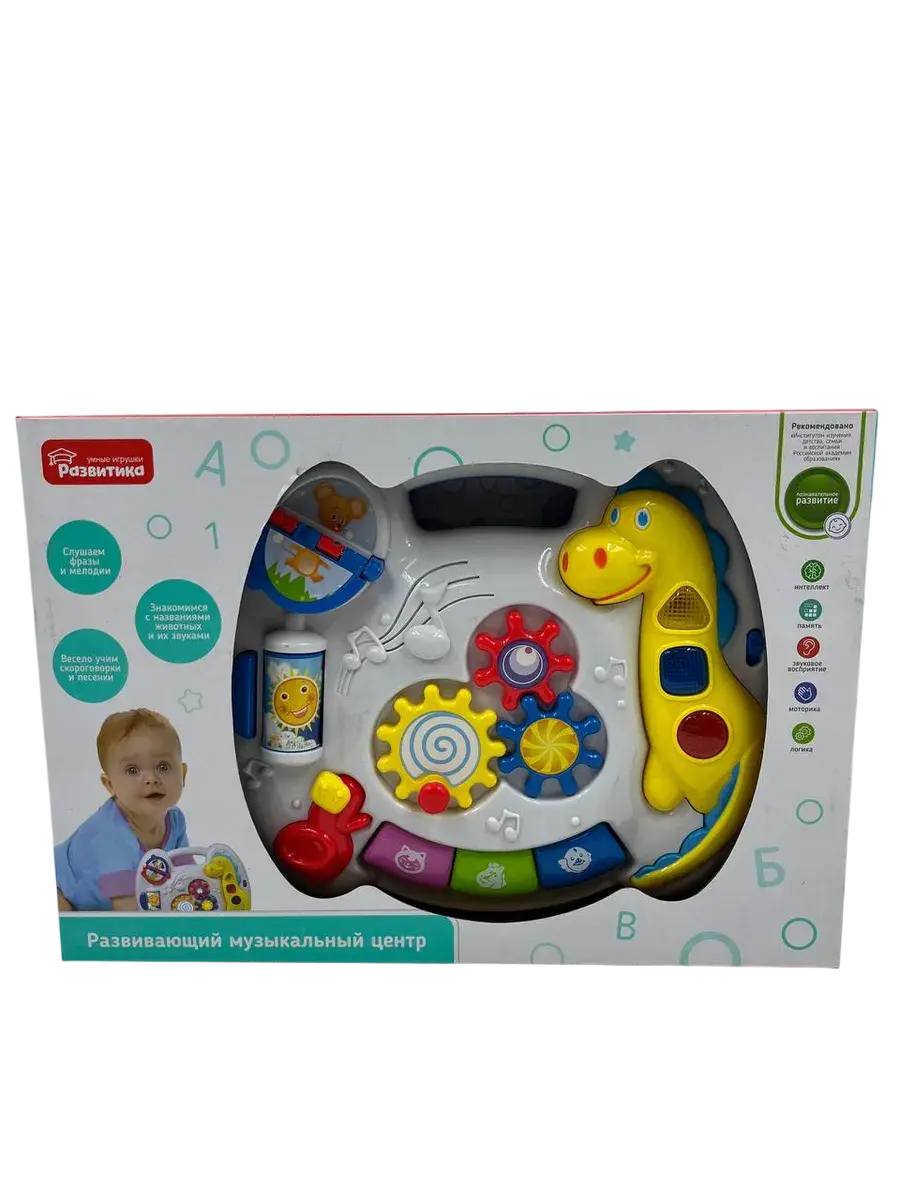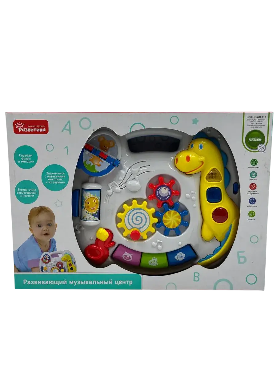 Игровой центр Развитика Музыкальный центр — игрушка для раннего развития ребенка. Развивает у ребенка социально-коммуникативные навыки: воображение, логику, интеллект, мелкую моторику, звуковое и зрительное восприятие. Преимущества: Более 5 вариантов игры: шестеренки, книжка со скороговорками, крутящийся барабан, звуковая уточка, звуки животных. Более 20 звуков и мелодий. Весёлый смех, добрые стихи и множество смешных звуков. 10 интерактивных элементов. Нажми на кнопку - барабан закрутится. Переверни страничку - услышишь скороговорку 2 режима громкости. Можно настроить индивидуальный уровень громкости. 2 варианта крепления. Столик можно поставить на ножки, либо повесить с помощью специального крепления. Светящиеся кнопочки. Мигание ярких цветов понравится малышу. Русское озвучивание. Все стихии и скороговорки звучат на русском языке. Умные игрушки Развитика: Разработаны совместно с Институтом изучения детства, семьи и воспитания Российской академии образования Позволяют родителям развивать ребенка, играя Изготовлено из безопасных для здоровья детей материалов Дешевле аналогов на 20-40%, при этом ничуть не уступая им по качеству Работает на батарейках 3 х AA. В комплект не входят Предназначено для детей старше 3 лет. Развитика поможет Вашему ребенку овладеть необходимыми знаниями, умениями и навыками. Развитика — учимся, играя!