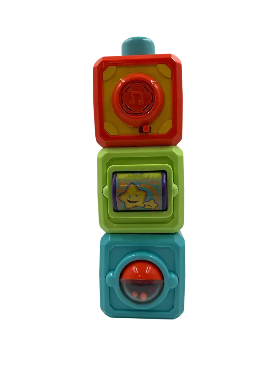 В комплекте три разноцветных кубика с разными функциями. Первый кубик имеет шарик с бусинками, который издает звуки при вращении. Второй кубик оснащен барабанчиком с картинками животных и подвижной дверцей. Третий кубик работает на батарейках: он воспроизводит мелодии, обучает цифрам, цветам и английским словам.