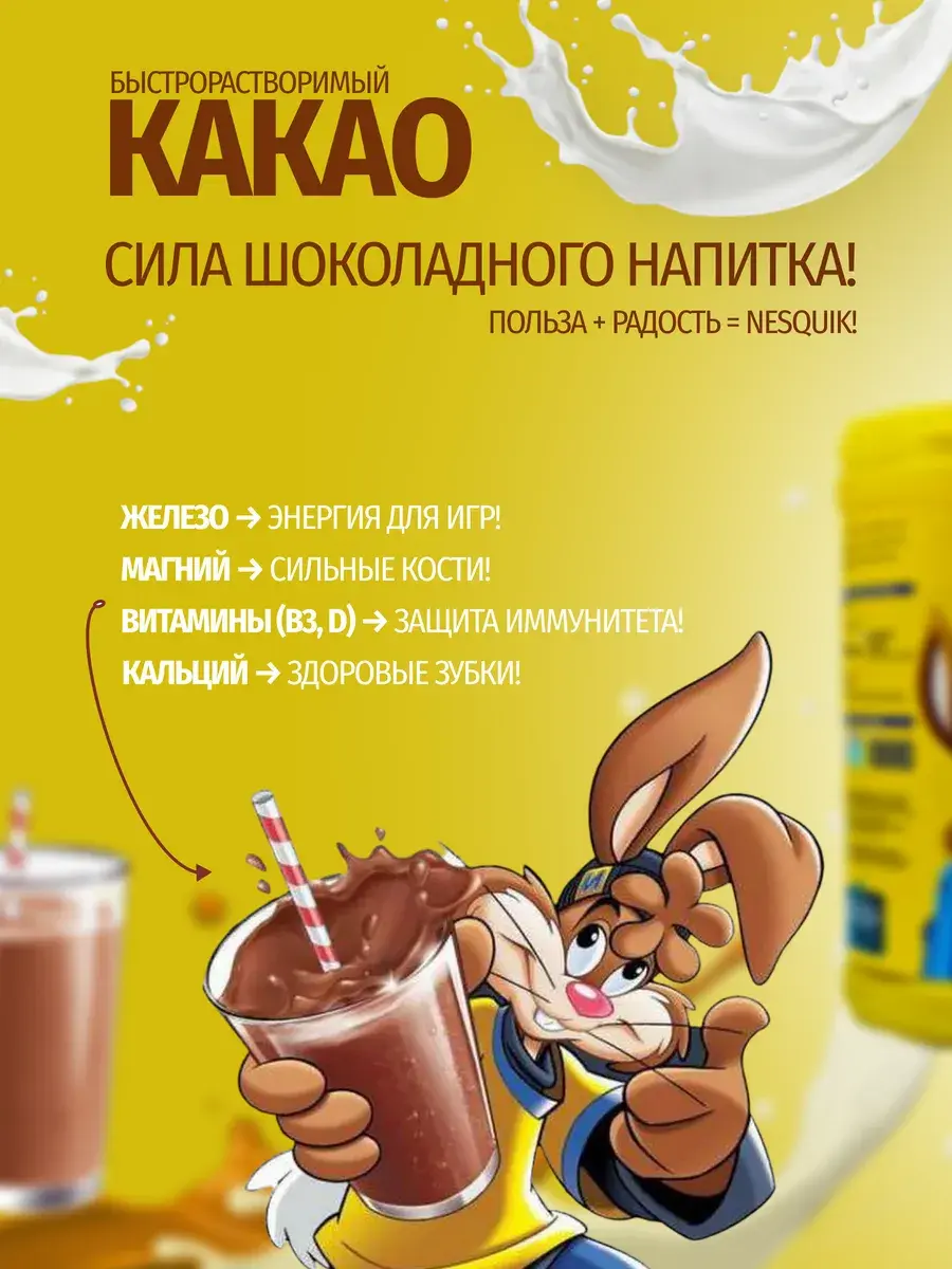 Какао Несквик обогащен витамином D, необходимым для нормального роста и развития костей у детей в рамках здорового питания и здорового образа жизни.