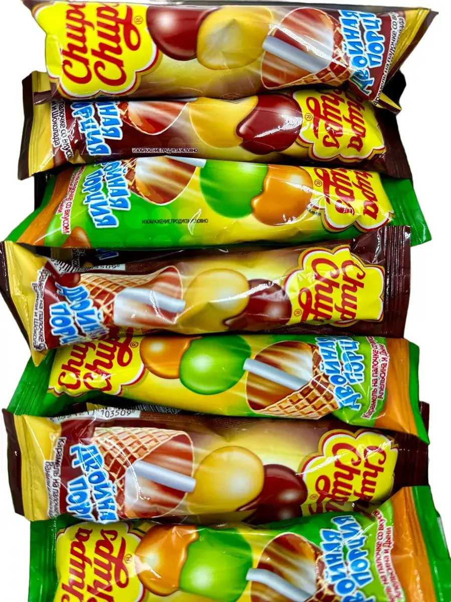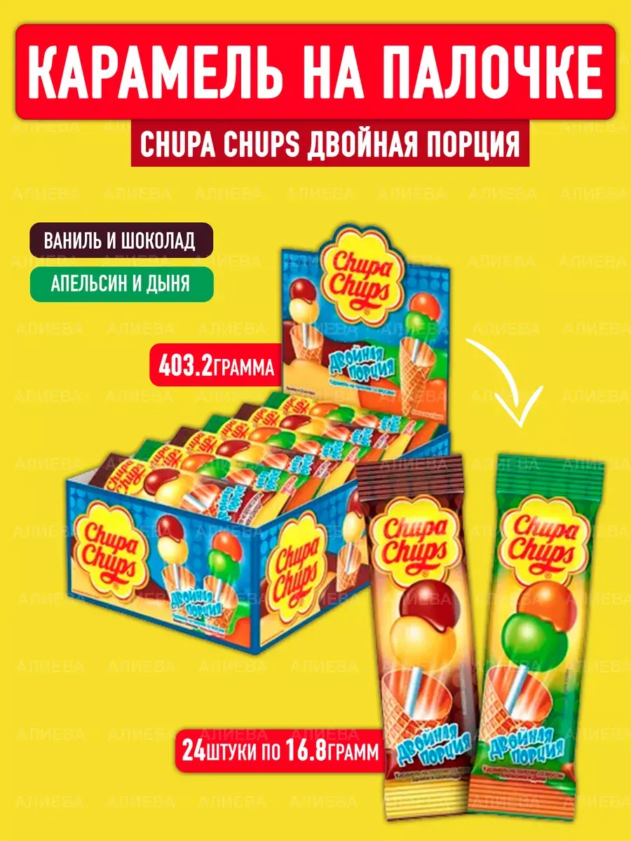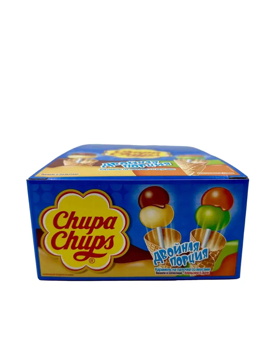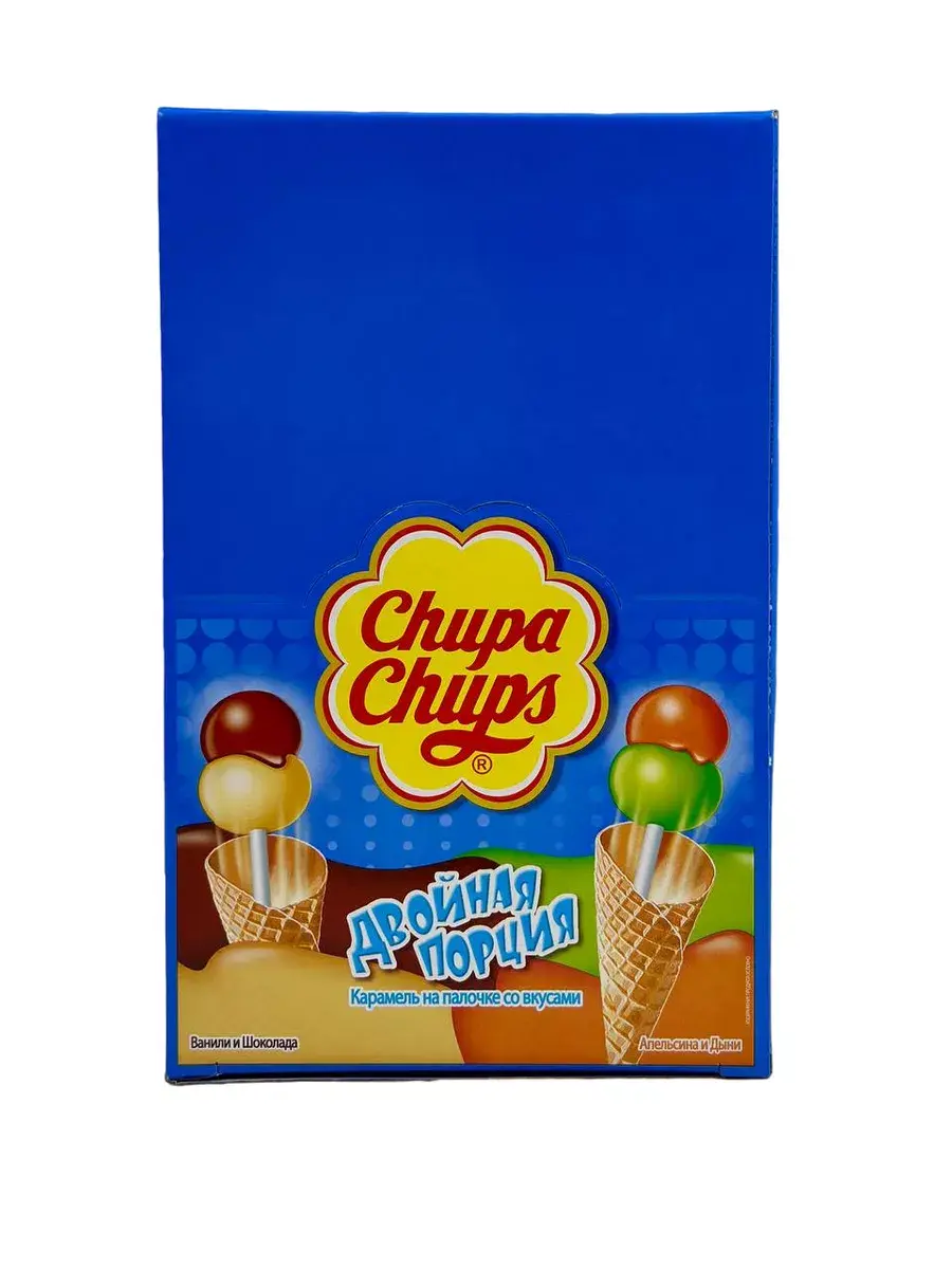 Карамель CHUPA CHUPS Двойная порция – это два шарика разной по вкусу карамели на одной палочке. Карамель сочетает между собой разные вкусы: ваниль-шоколад, дыня-апельсин.