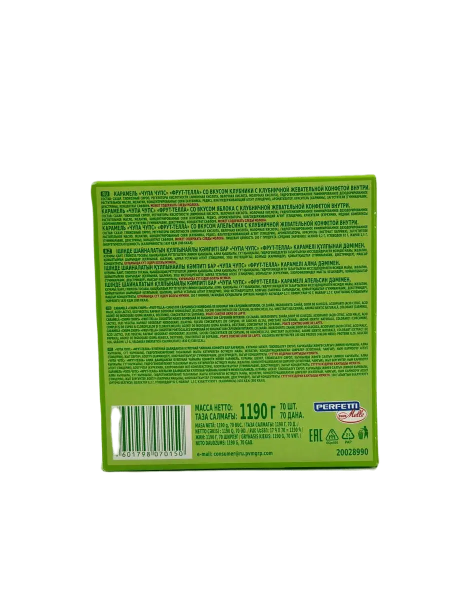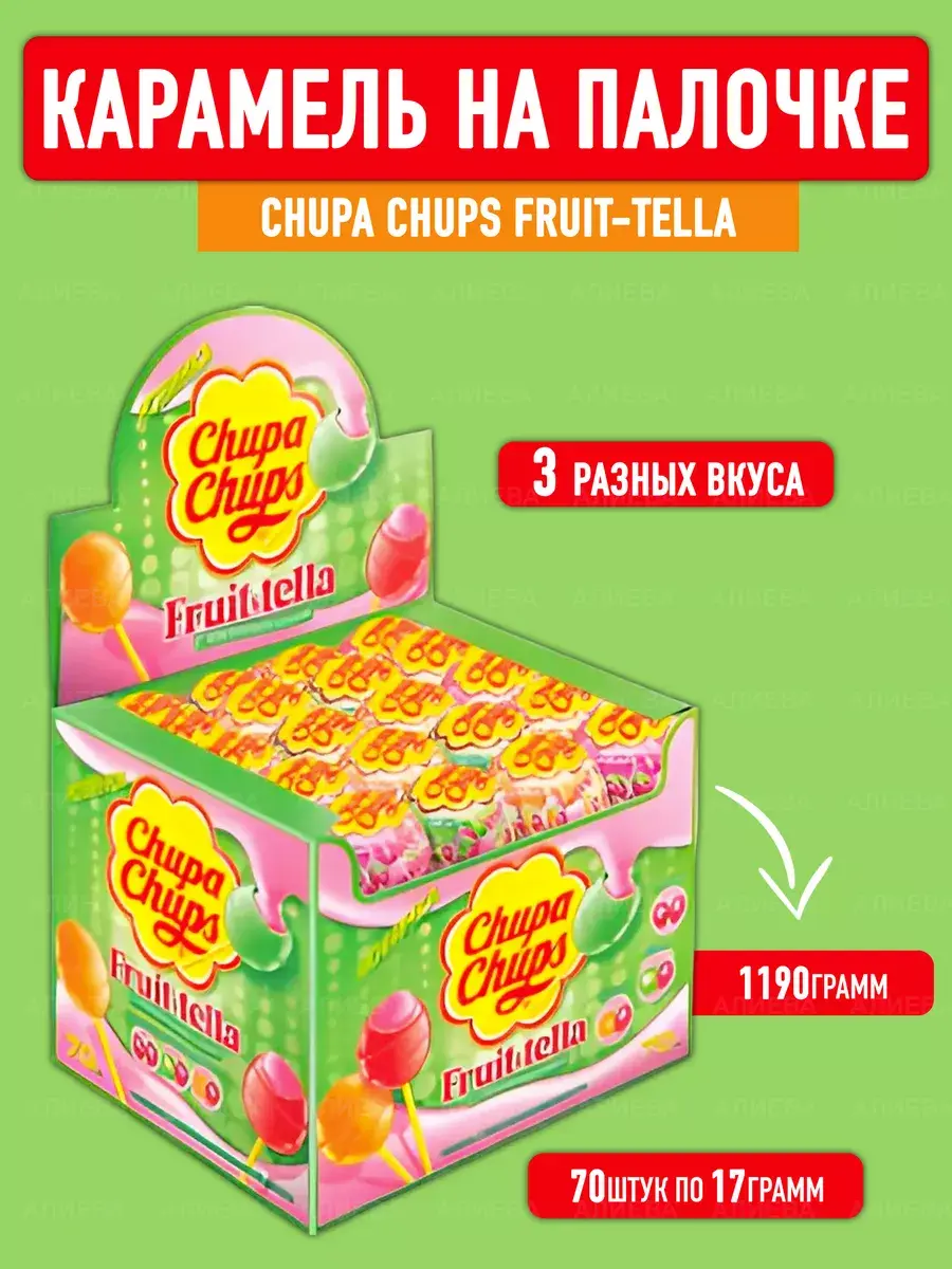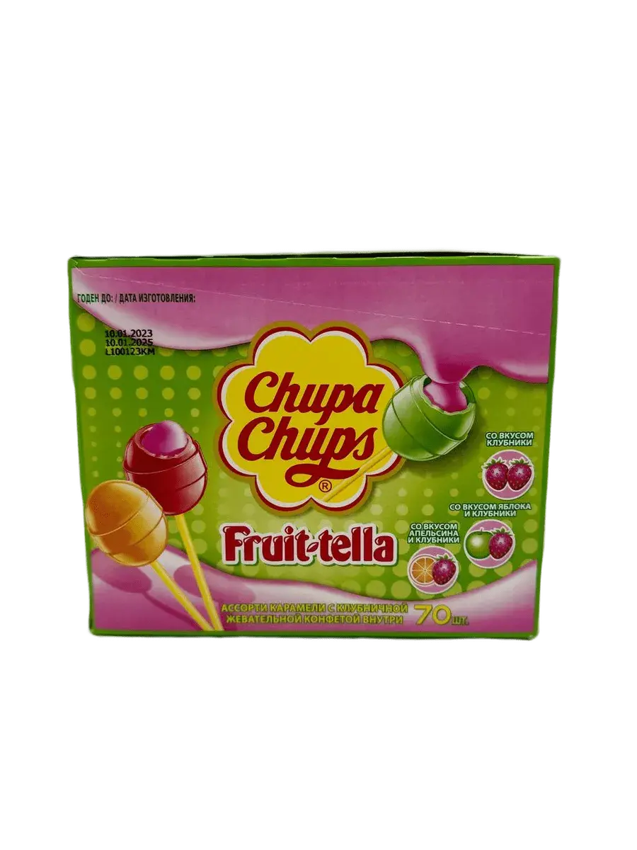 Карамель Chupa Chups Фрут-телла c клубничной жевательной конфетой внутри – это уникальное сочетание вкусов клубники, сочного апельсина и зеленого яблока.70 штук карамели на палочке Chupa Chups Фрут-телла в одном шоубоксе станут отличным дополнением к любой вечеринке, их можно брать в гости или дарить друзьям. Попробуйте карамель Chupa Chups Фрут-телла!
