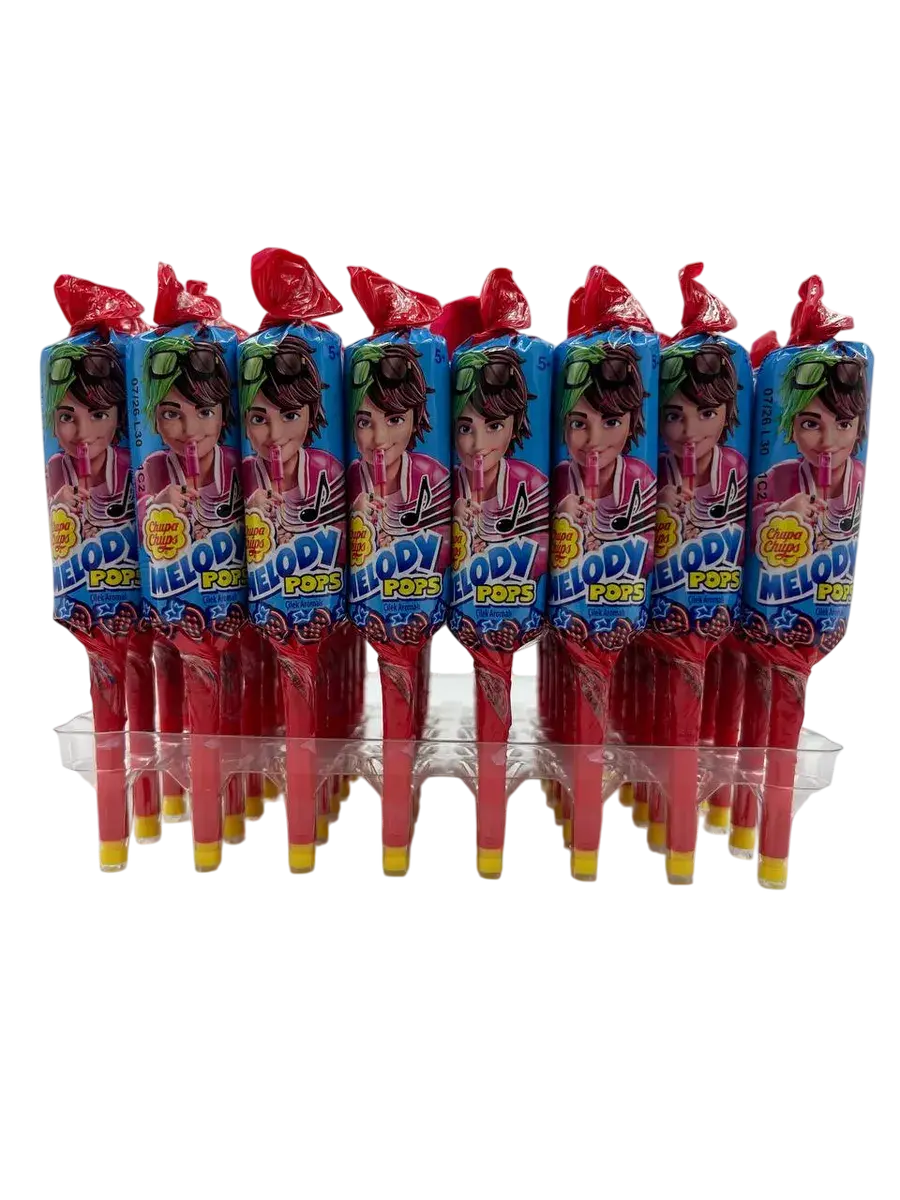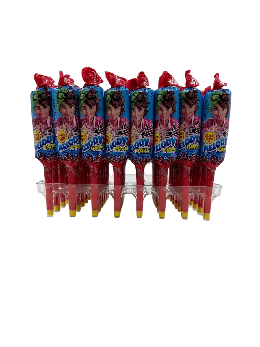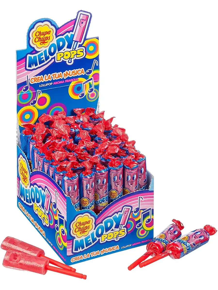 Конфеты с палкой отстой Чапс Мелодия Pops клубничного вкуса. Коробка содержит 48 единиц 15 граммов конфет с палкой Chupa Chups Мелодия поп. Создавайте свою собственную музыку с помощью мелодии Pops.
