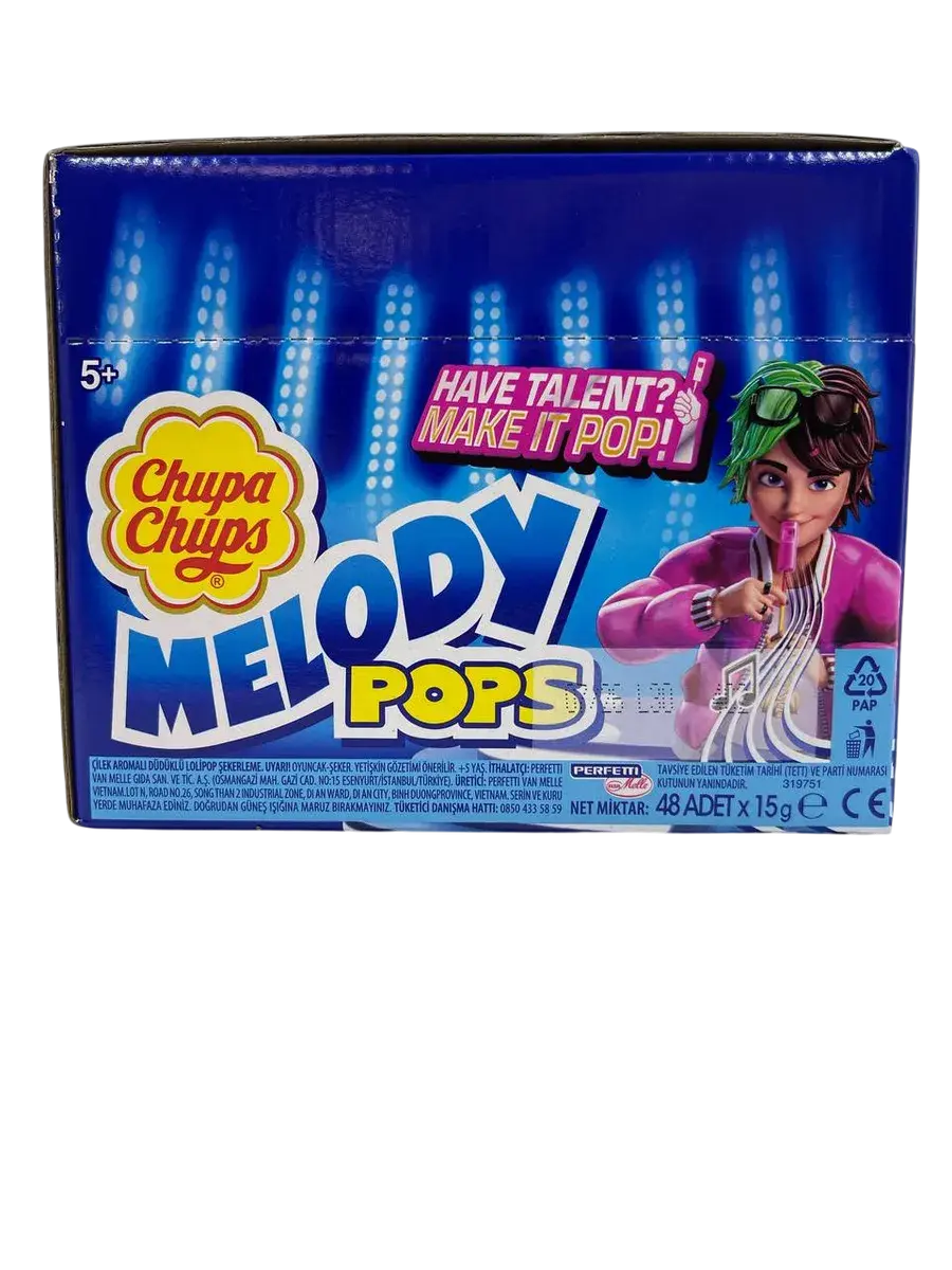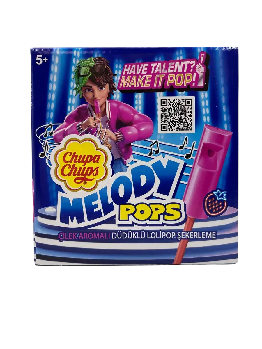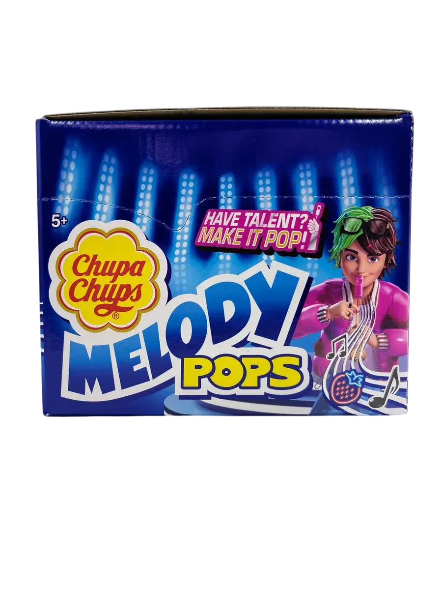 Конфеты с палкой отстой Чапс Мелодия Pops клубничного вкуса. Коробка содержит 48 единиц 15 граммов конфет с палкой Chupa Chups Мелодия поп. Создавайте свою собственную музыку с помощью мелодии Pops.