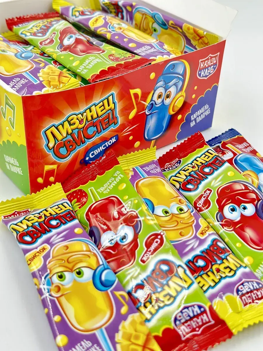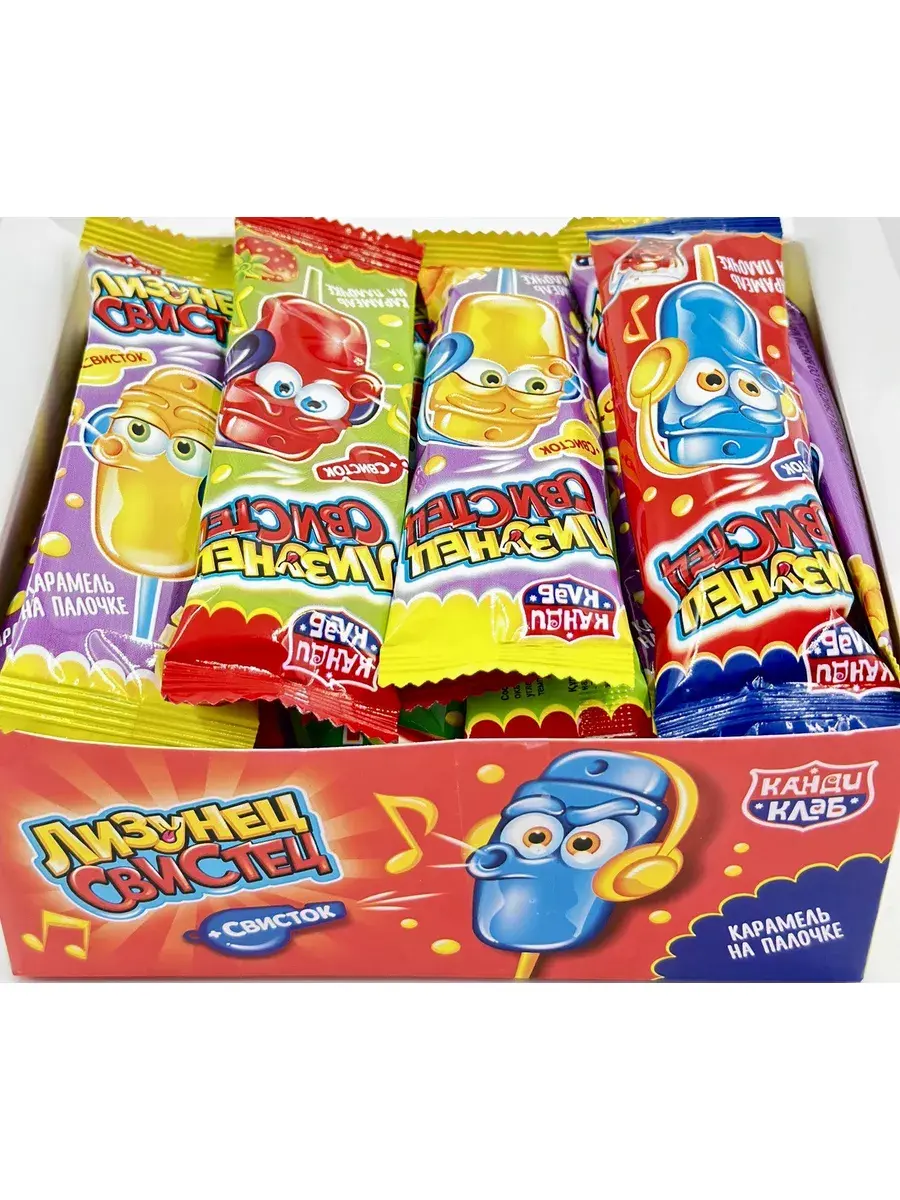 Каждый Лизунец Свистец упакован в яркую индивидуальную обертку, что делает его идеальным для раздачи и подарков.