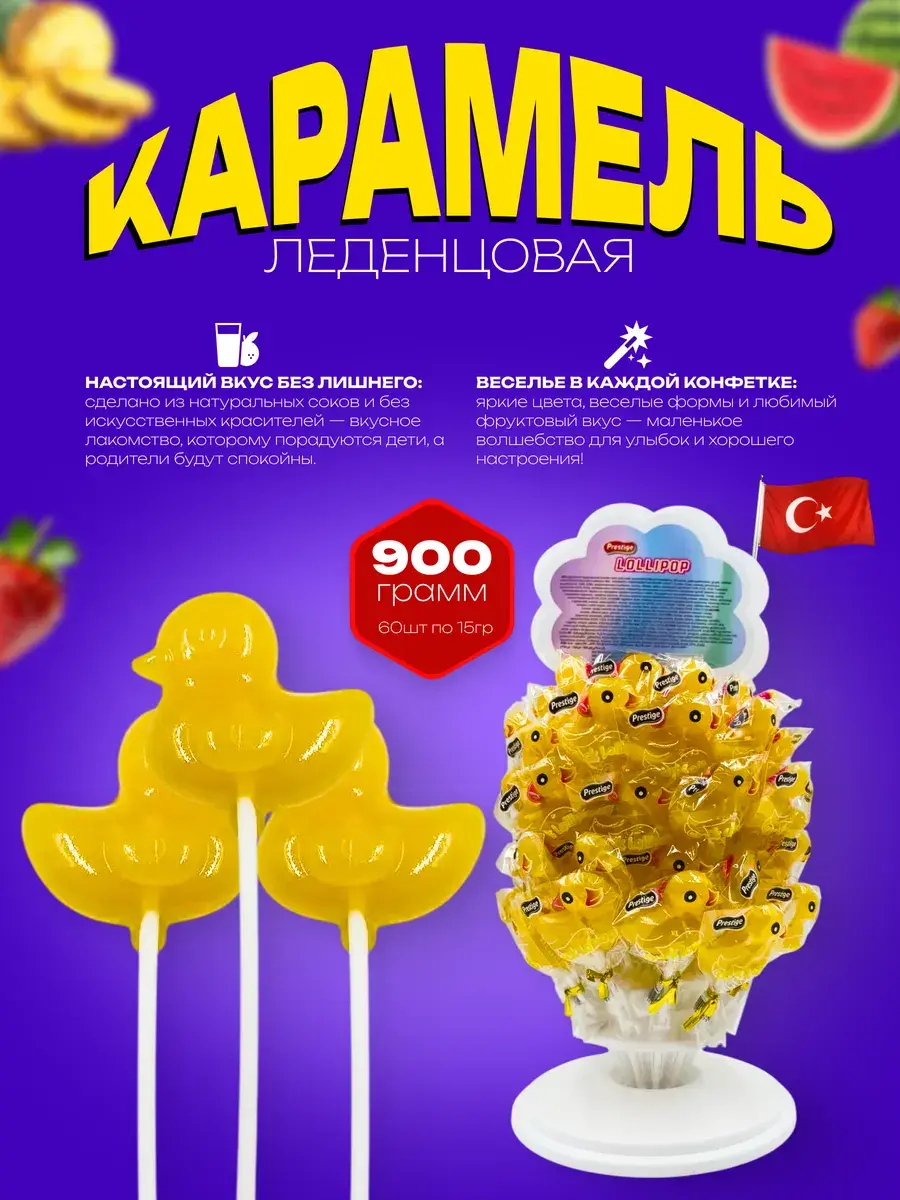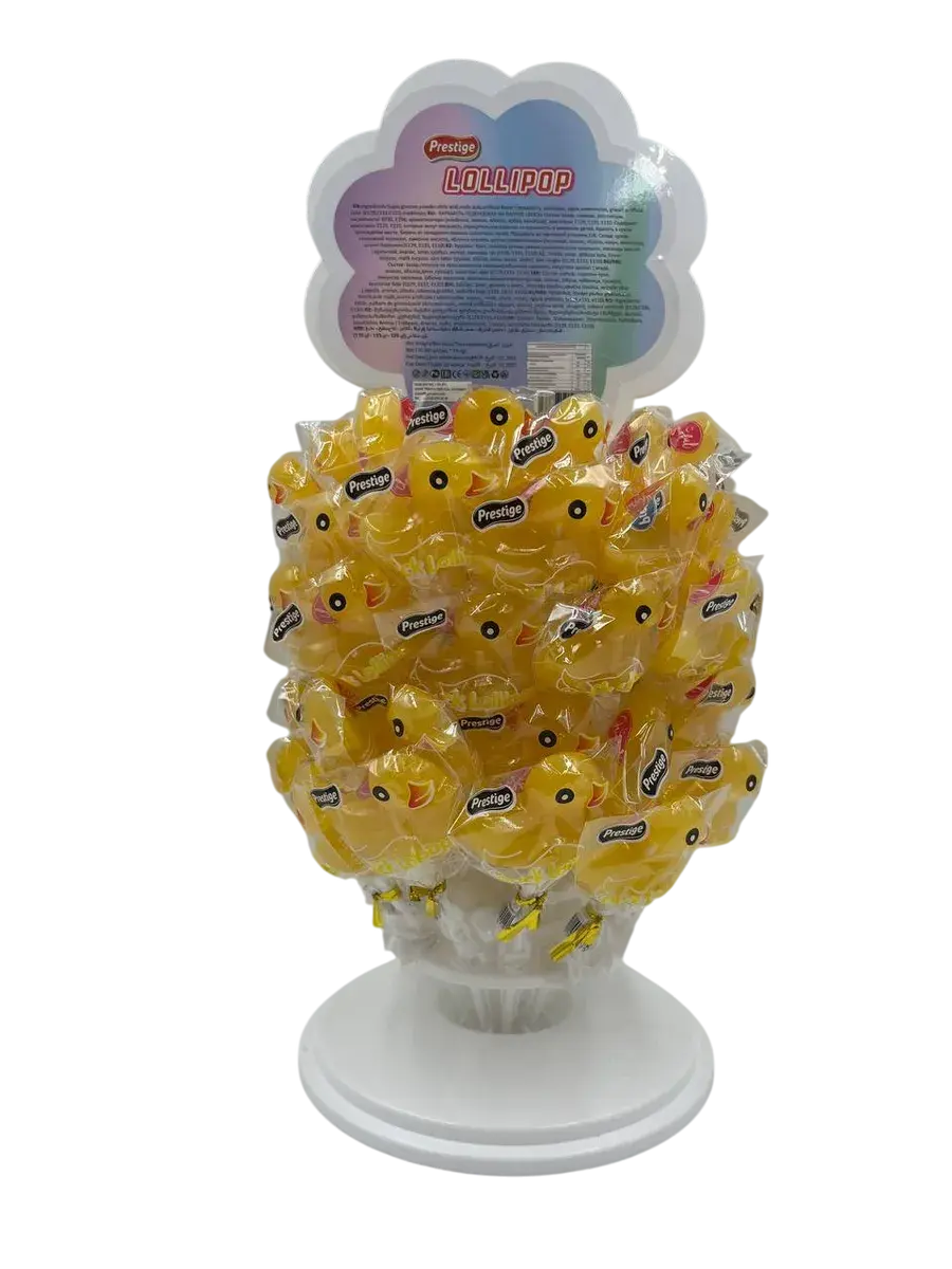 Леденцы на палочке в форме уточек от турецкого бренда Prestige – это очаровательное лакомство, которое понравится детям и взрослым. В каждой упаковке вас ждет 60 леденцов с пятью нежными вкусами: сладкая ваниль, сочная малина, освежающий лимон, медовый персик и сливочная карамель.