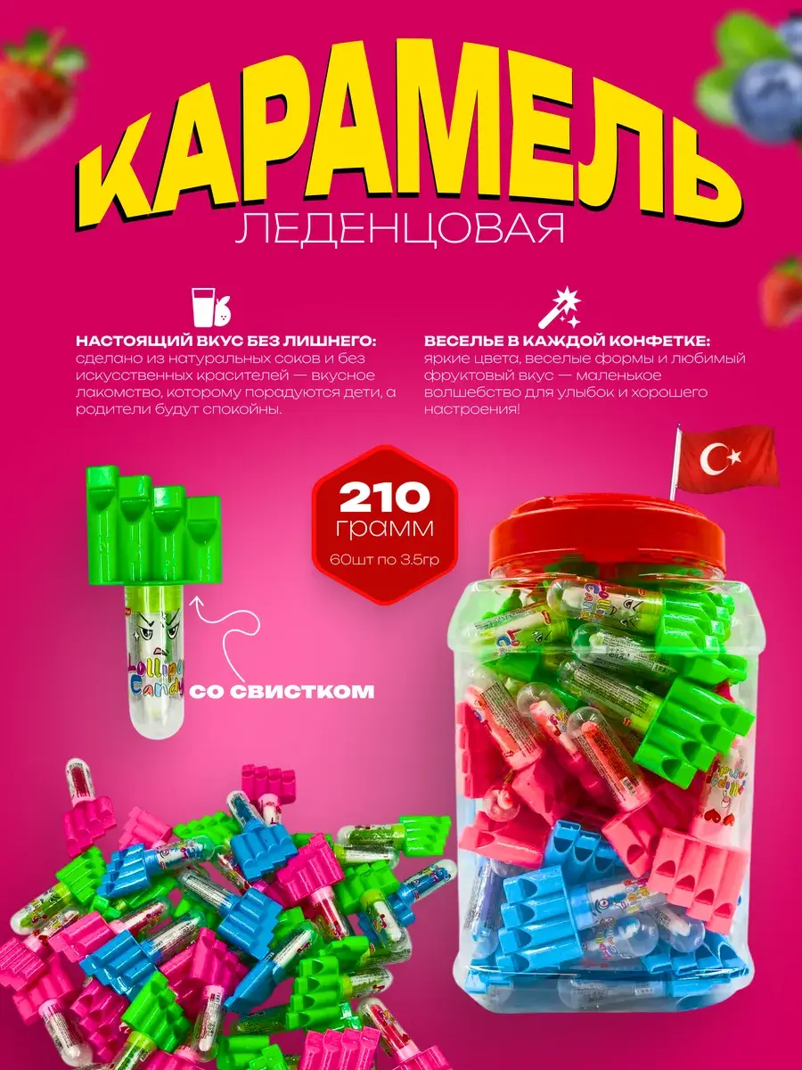 Встроенный свисток в каждом леденце – создавайте веселые мелодии, устраивайте шуточные переклички или просто поднимите настроение себе и окружающим!