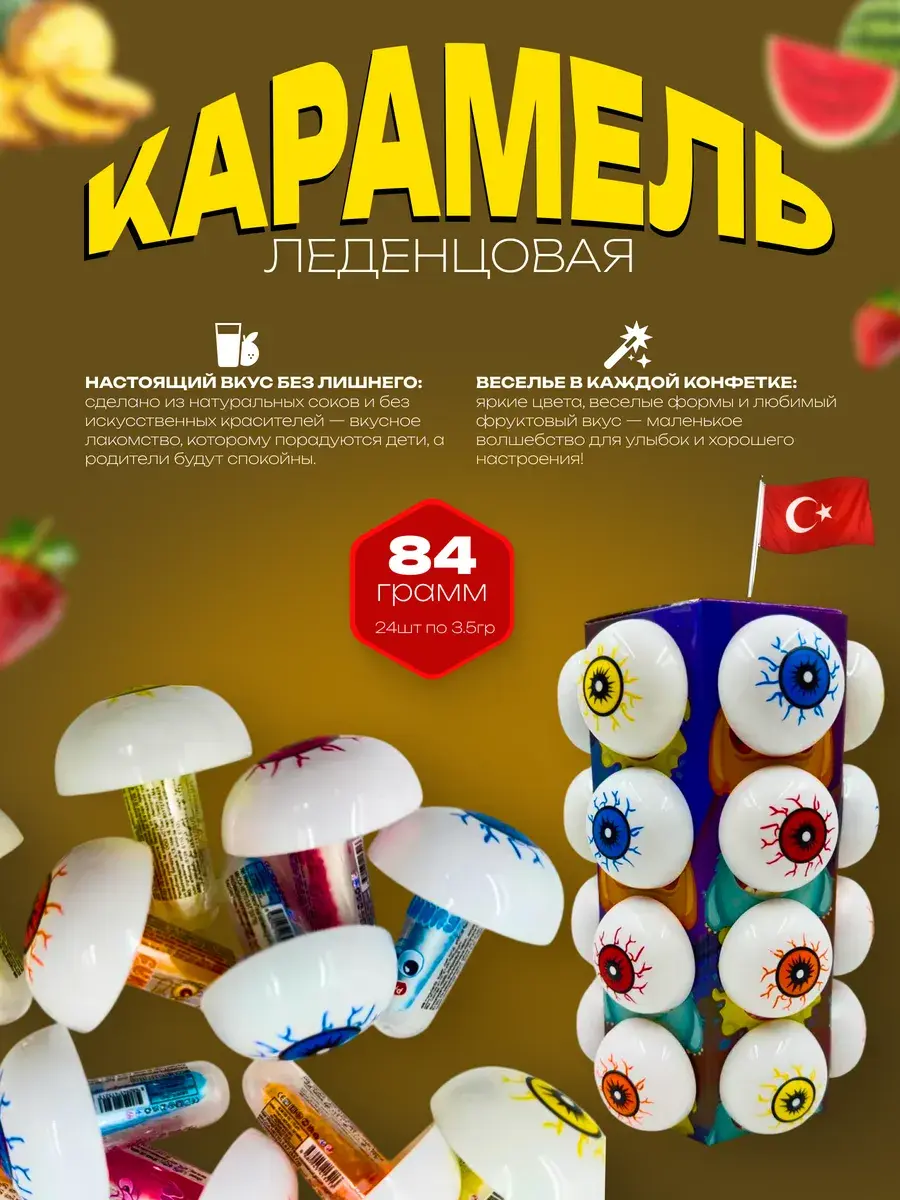 Леденцы с глазом– сладкое ассорти, которое поднимет настроение и взрослым, и детям. Каждая карамель выполнена в форме глаза , добавляя забавности к нежному вкусу. В упаковке вас ждет 24 штуки по 3,5 грамма каждая – идеальный вариант для веселых перекусов и оригинальных подарков. Закажите карамель с глазом и насладитесь не только сладостью, но и забавным дизайном!