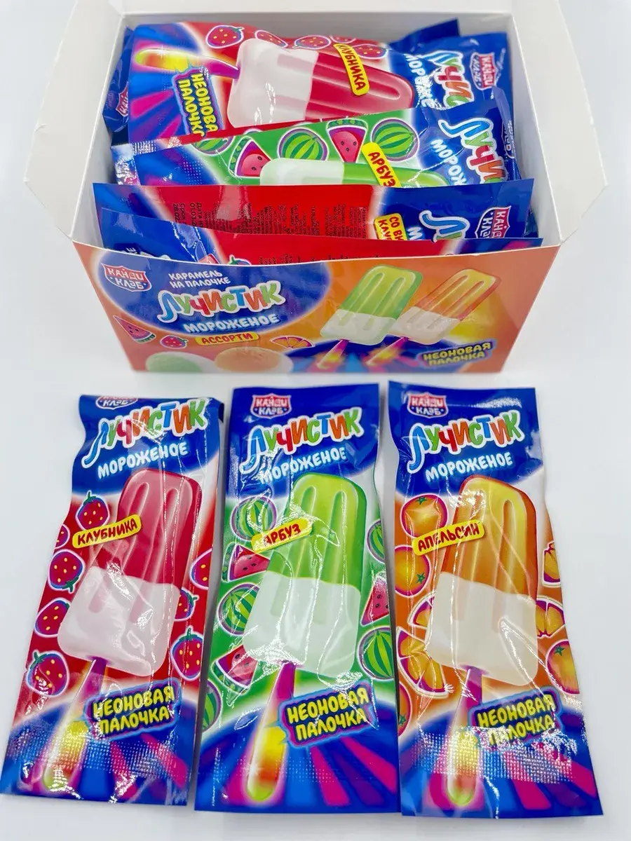 Приготовьтесь к сладкому волшебству с Канди клаб и насладитесь вкусом детства! Наши карамельные леденцы - это не только главная сладость вашего детства, но и яркое украшение для любого праздника. Представьте себе леденец на неоновой палочке, в форме мороженого, который притягивает взгляды своей оригинальностью!