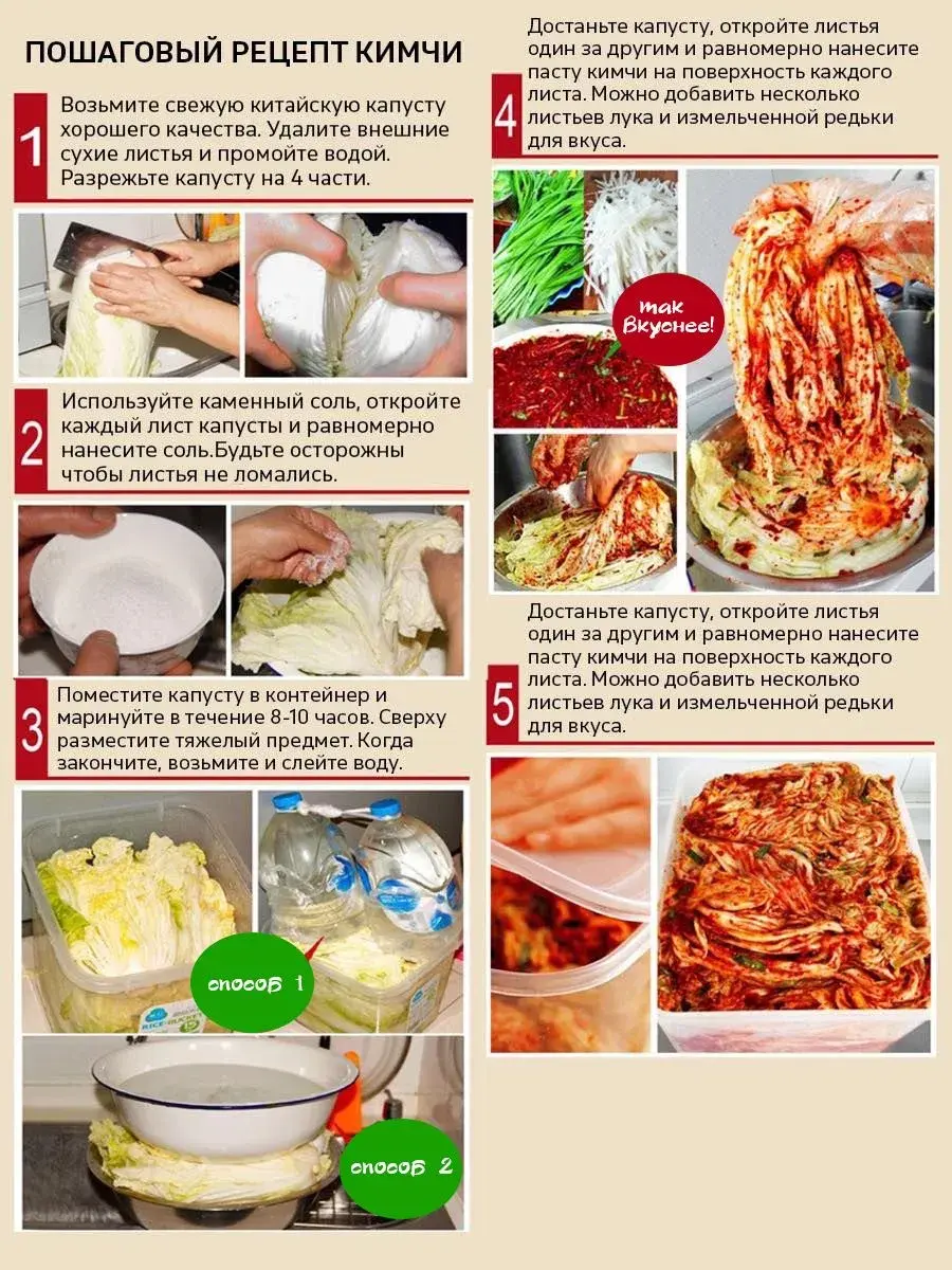 Паста для маринада для традиционного корейского блюда - кимчи. Кимчи - это ферментированные овощи (пекинская капуста, редька и др.) в остром пряном маринаде. Натуральный сотав и и приятная острота никого не оставит равнодушным ! Почти ни одно застолье в Китае, Корее, Вьетнаме и Японии не обходится без кимчи. Чтобы приготовить кимчи в домашних условиях можно смело использовать эту заправку.Вариант приготовления: свежую пекинскую капусту (предварительно вымытую, высушенную и разрезанную вдоль пополам) тщательно просолить обычной солью, не пропуская ни одного листа. Поместить в контейнер (или любую другую посуду) и оставить под грузом минимум на 8-10 часов. После этого слить лишнюю жидкость и равномерно нанести заправку для кимчи на каждый лист. По желанию можно добавить зелень или репчатый лук. Поместить готовое блюдо в контейнер еще на 1-2 часа и можно есть. Приятного аппетита!Примечание: один пакет заправки рассчитан примерно на 3 кг капусты.