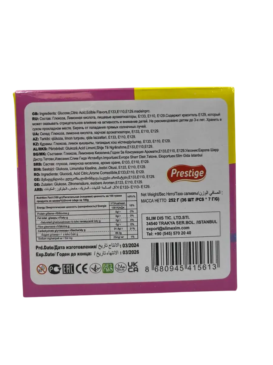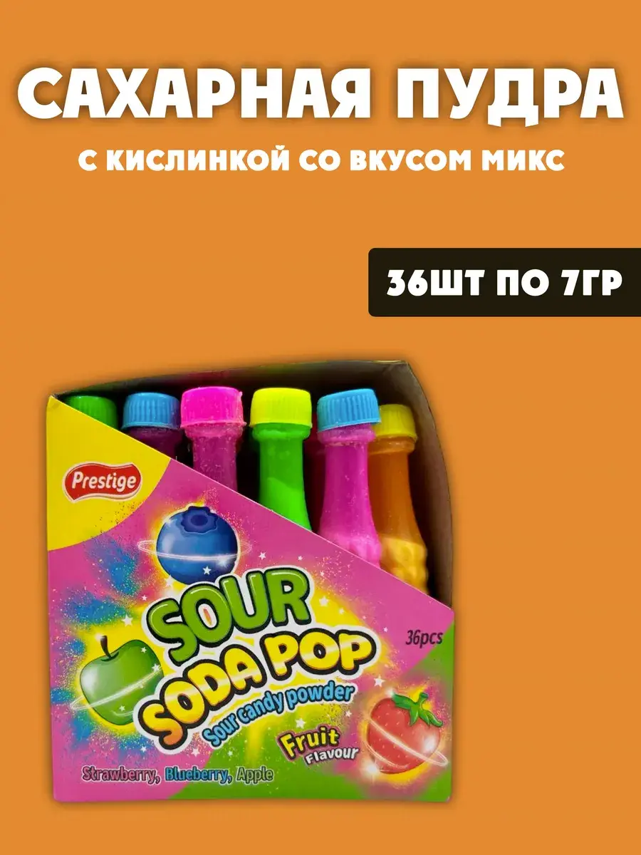 Попробуйте классную, а главное вкусную сахарную пудру от турецкого производителя Prestige. В каждой упаковке вас ждет 36 миниатюрных бутылочек по 7 грамм каждая с потрясающим миксом вкусов: сочная клубника, свежее яблоко и ароматная голубика. Это сладкое удовольствие в забавной упаковке обязательно понравится вам и вашим одноклассникам.