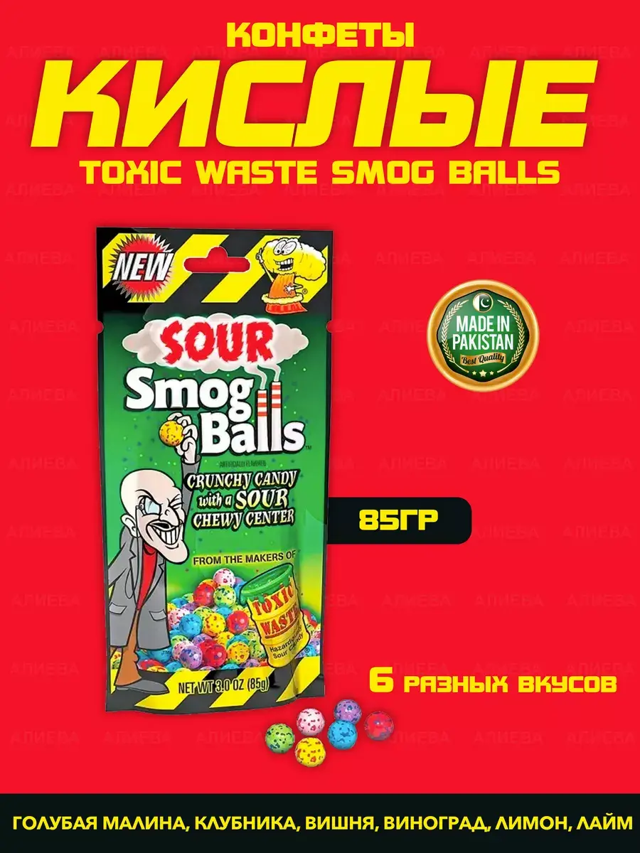 Хотим представить еще один шедевр от известного бренда Toxic Waste. Кислые конфеты Toxic Waste Smog Balls -это интересный вариант разноцветных конфет с хрустящей кислой корочкой снаружи и удивительно жевательной кислой сердцевиной.В каждой упаковке содержит шесть видов разноцветных жевательных конфет:Синие -голубая малина,Белые -клубника,Красные - вишня,Фиолетовые-виноград,Желтые - лимон, Зеленые- лайм.