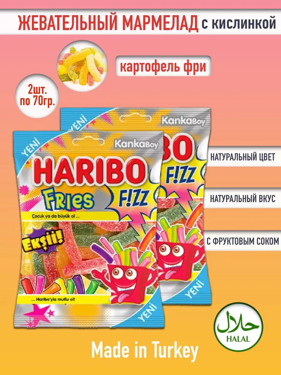 Жевательный мармелад Haribo - это настоящее воплощение сладкой радости! Импортный продукт, который порадует всех любителей конфет. Вкусный и разнообразный, он представлен в нескольких вариантах, чтобы удовлетворить все желания. Харибо - это бренд, который известен своим высоким качеством и неповторимыми вкусами. Жевательный мармелад Haribo подходит для всех возрастов: дети обожают его за яркие цвета и сладкий вкус, а взрослые наслаждаются его нежной текстурой и богатством ароматов. Попробуйте этот замечательный продукт , кислый мармелад в форме картошки фри , и почувствуйте себя настоящим гурманом!