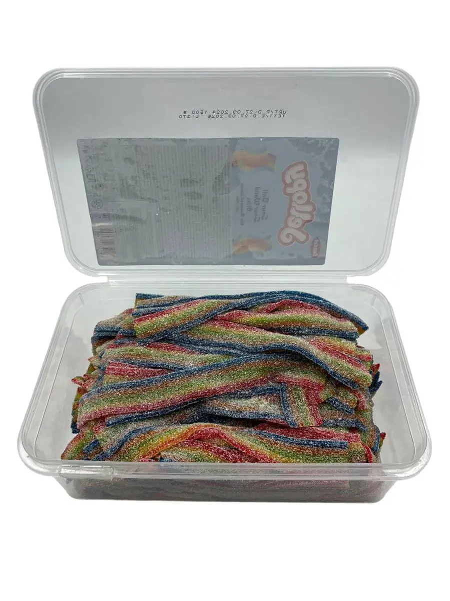 - Удобная упаковка: прозрачный пластиковый контейнер сохраняет свежесть продукта, а благодаря специальным щипцам вы сможете легко брать кислые ленты мармелад — никаких липких пальцев!