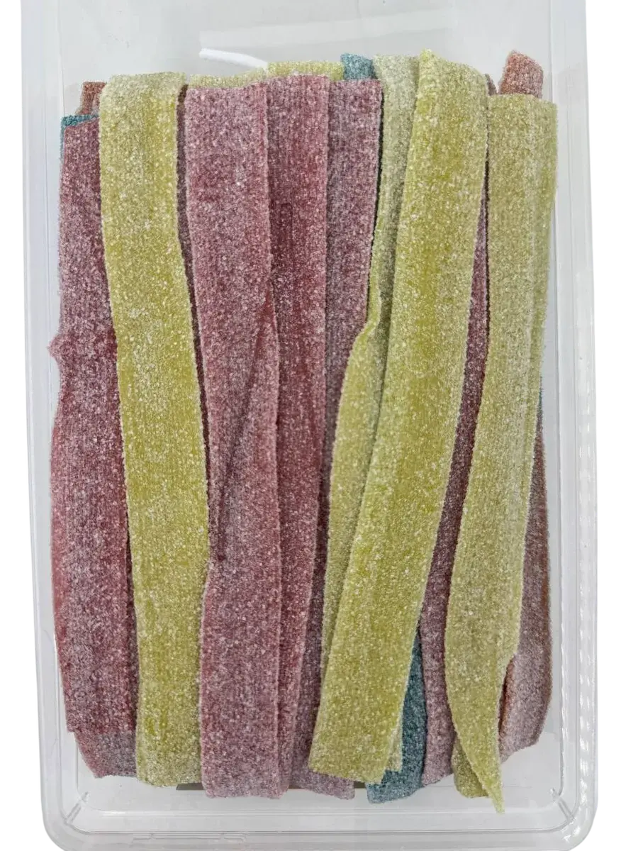 - Кислый мармелад ленты в обсыпке — мягкий, жевательный и с приятной кислой пудрой, которая так нравится любителям сладостей.