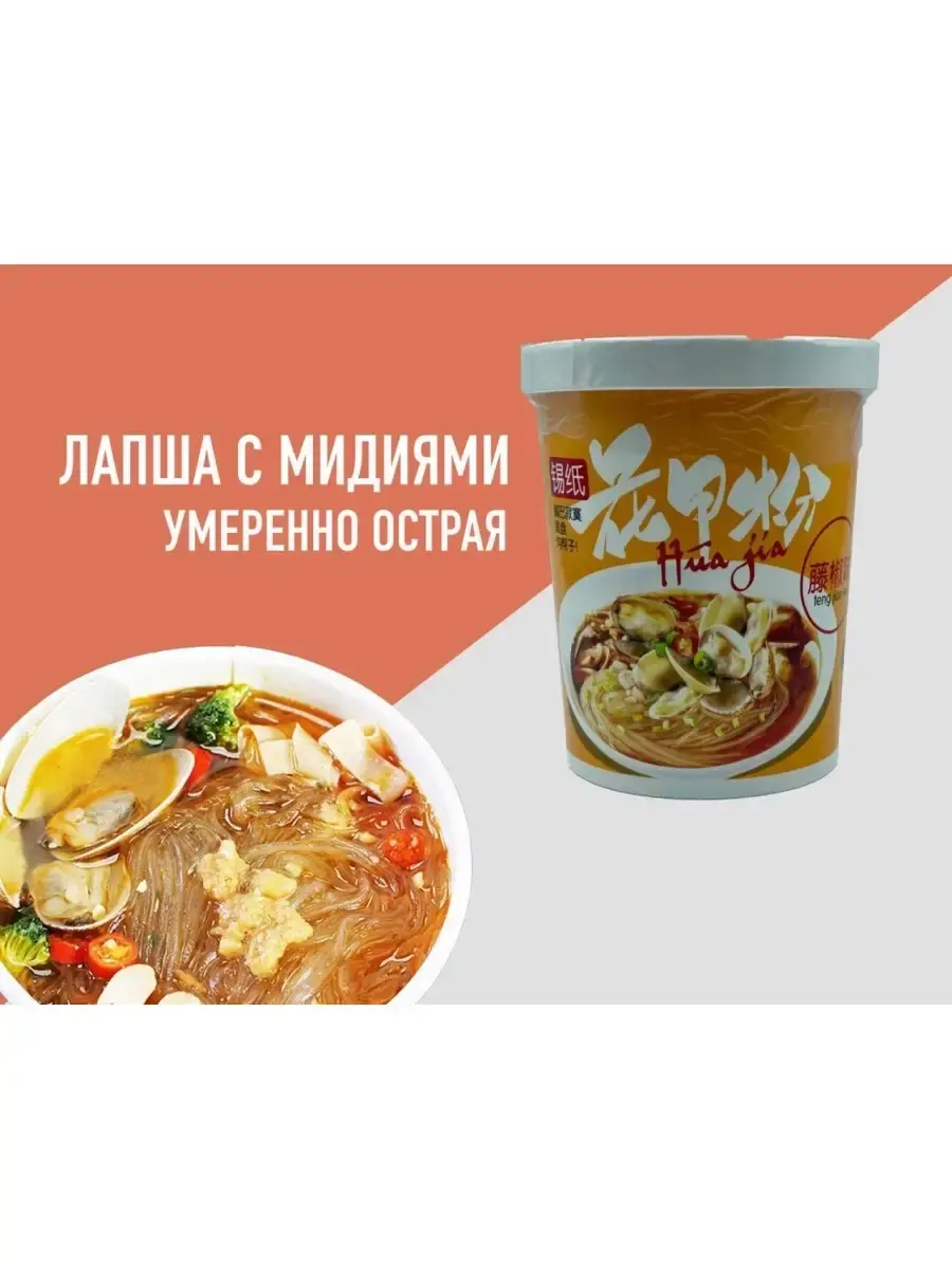 Китайская суп-лапша быстрого приготовления с настоящими мидиями от производителя Huajia. Оригинальный и не повторимый бульон со множеством необычных ингридиентов. Удобно брать с собой в дорогу). У нас представлены 3 вида лапши: 1. В синем стакане-не острый бульон с креветочным соусом; 2. В желтом стакане - средне острый соус; 3. В красном стакане - острый соус с кусочками перца чили красного и зеленого.