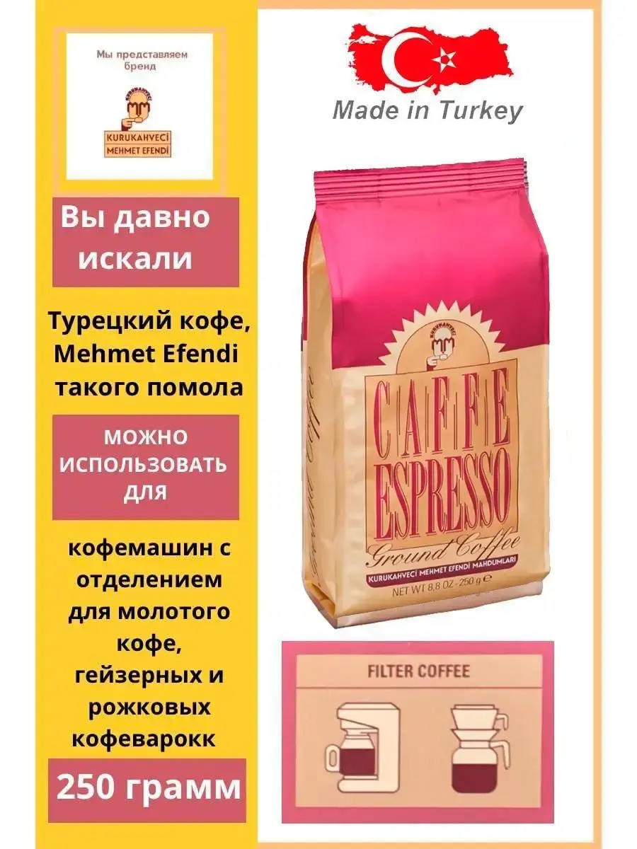 Kофе Мехмет Эфенди Эспрессо изготовлен из арабики высшего сорта. Помол идеально подходит для гейзерных кофеварок и кофемашин. MEHMET EFENDI -кофе номер 1 в Турции, благодаря непревзойденному качеству и верности традициям. Специальная мягкая металлизированная упаковка позволяет кофе сохранять свой вкус и аромат максимально долго. Кофе по-турецки MEHMET EFENDI наилучшее решение для тех кто предпочитает максимально свежий кофе. Идеален для приготовления в турке либо кофеварке по-турецки.