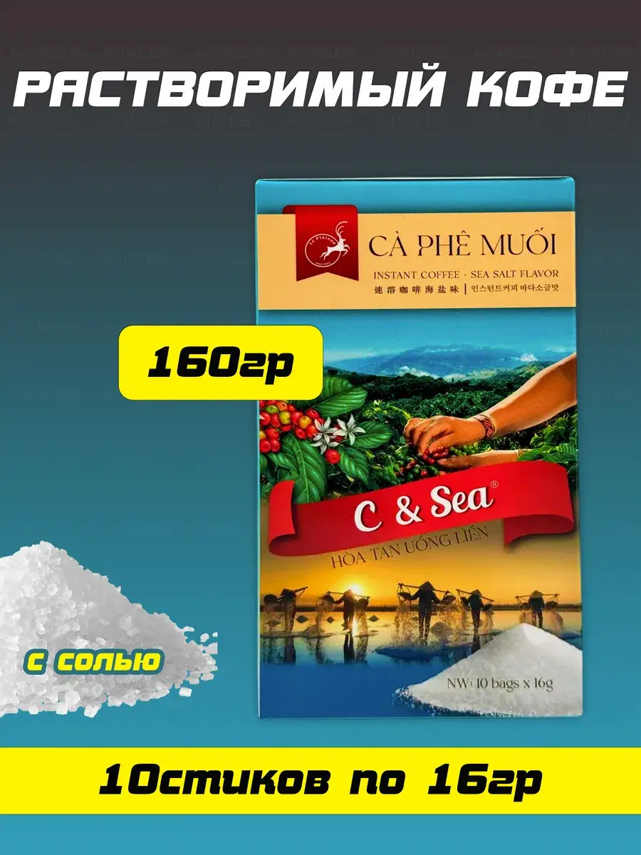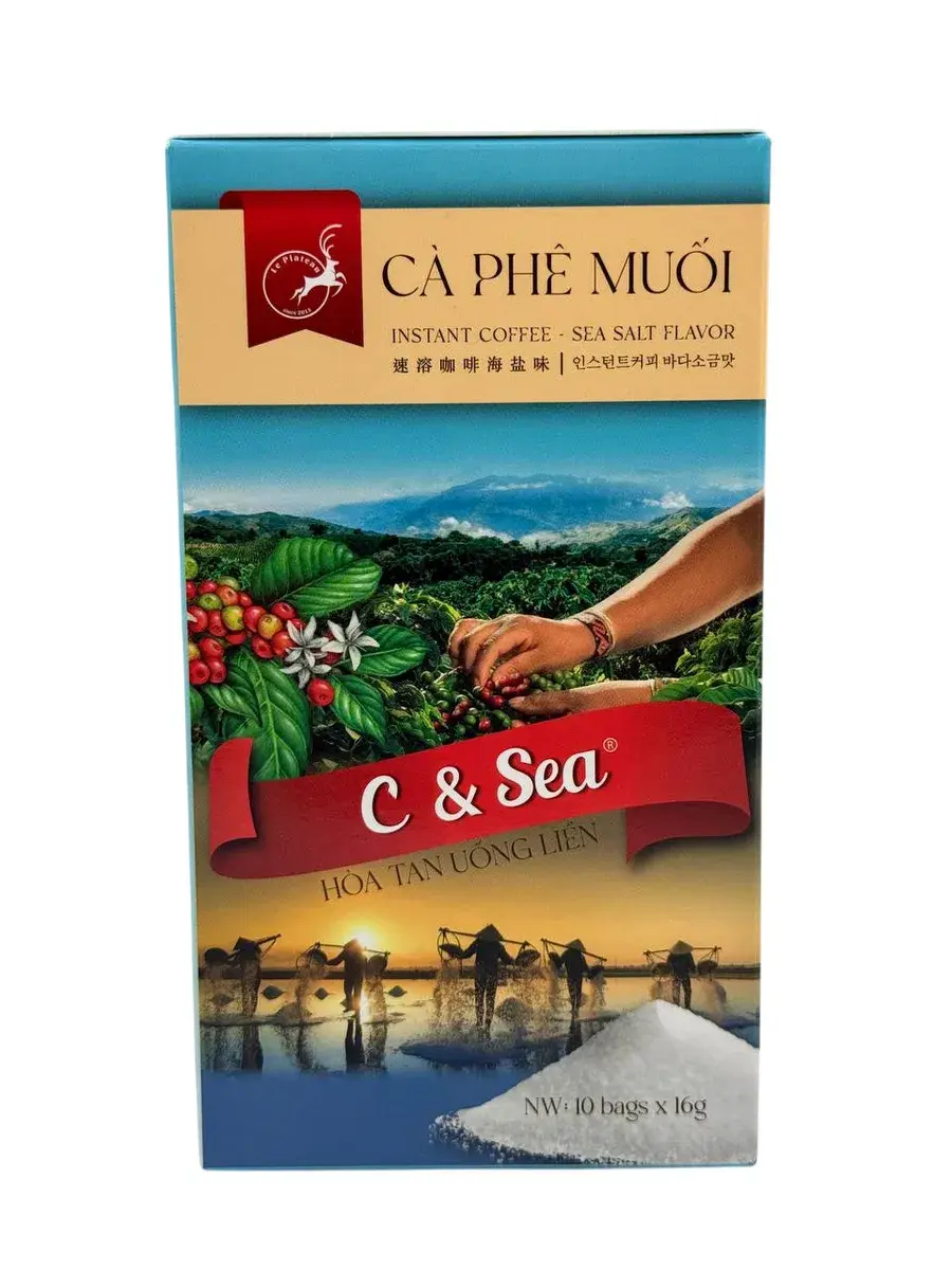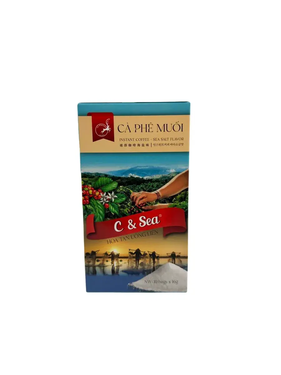 Название C & Sea (Кафе и море) - растворимый кофе с солью - это великолепное сочетание насыщенного кофе с гор Центрального нагорья и солоноватого вкуса морской соли Нячанга. Вы ощутите аромат и наслаждение от milk foam – гладкого слоя молочной пены, созданного с использованием передовых технологий.