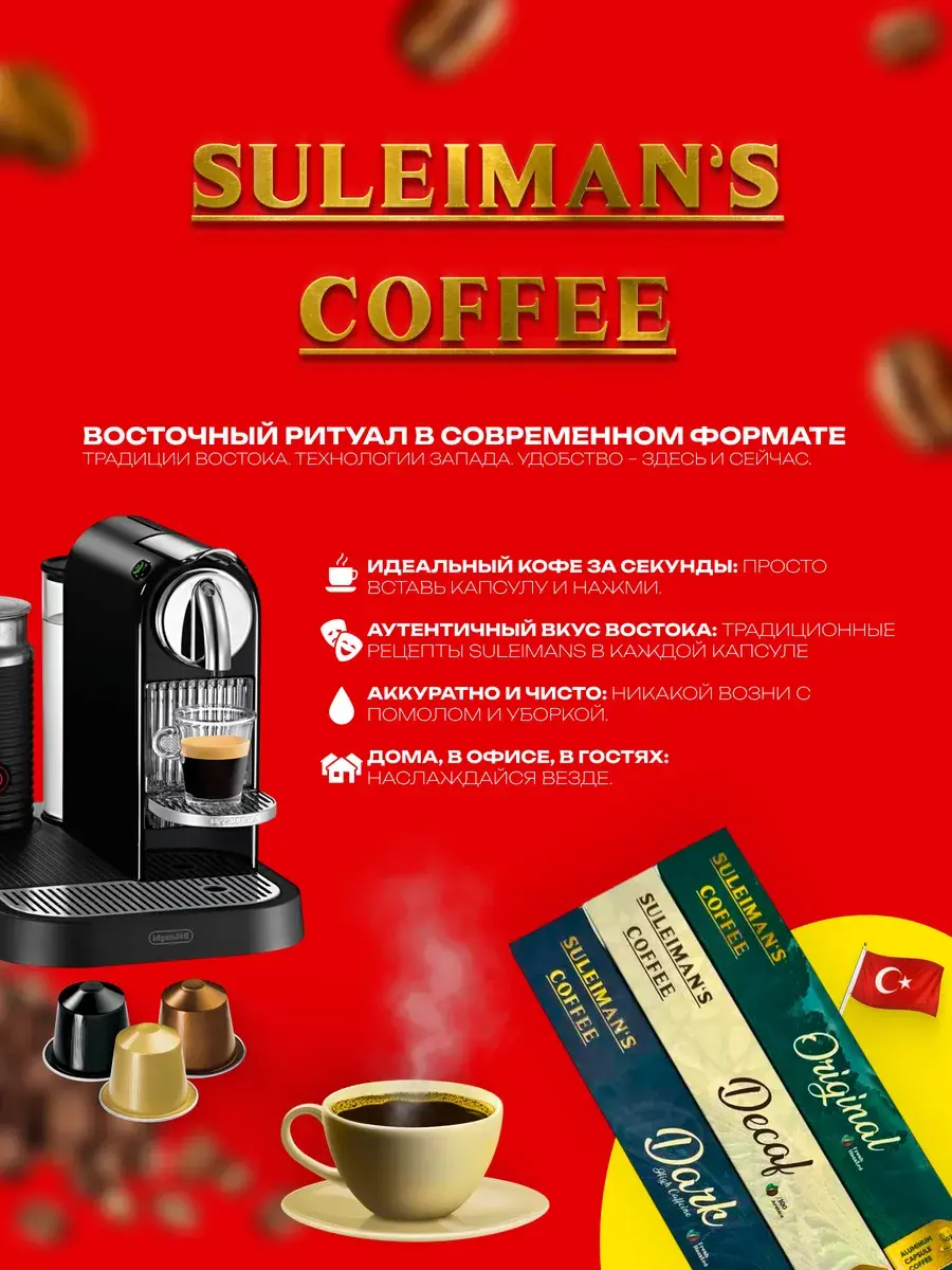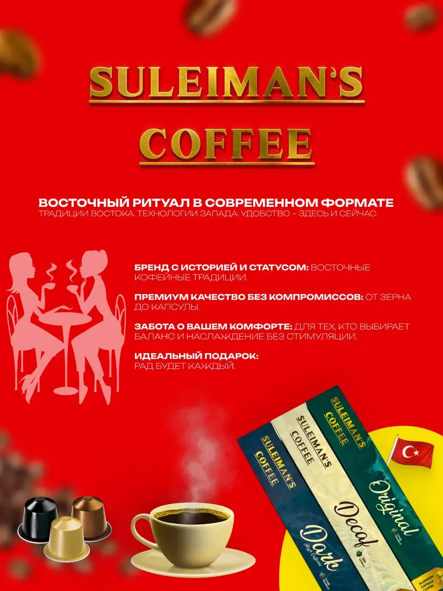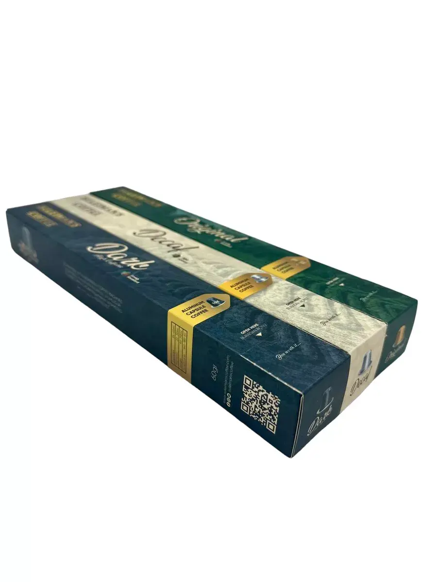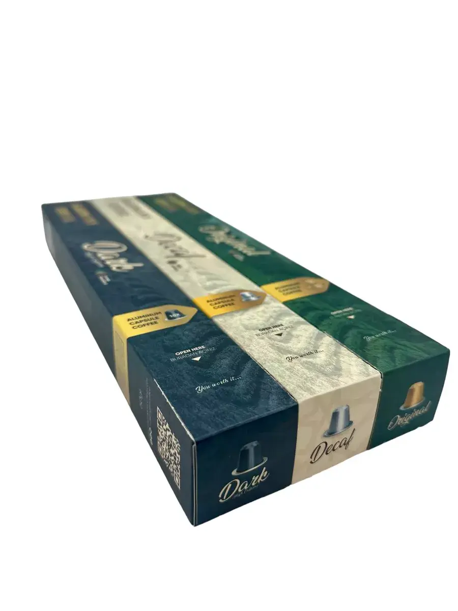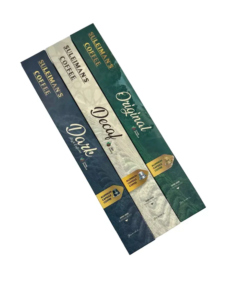 Серия капсул Suleiman's Coffee, совместимая с Nespresso, предлагает три уникальных вкуса: Оригинальный , Без кофеина и Сильной прожарки. Каждый из них специально разработан для удобного, вкусного и чистого кофе дома. Благодаря интенсивным ароматам, богатому телу и тщательно выверенным профилям обжарки каждая чашка привнесет дух Стамбула в ваш дом.