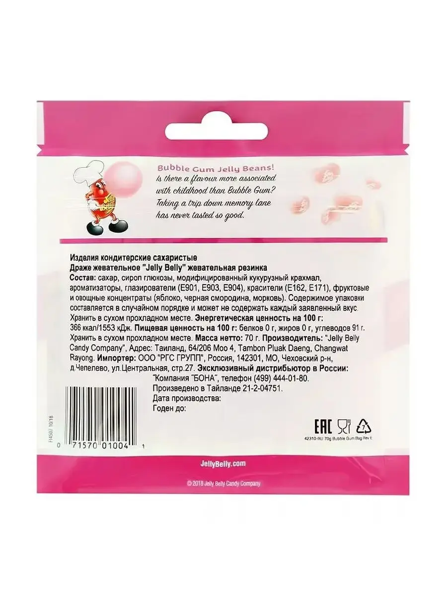 Конфеты Jelly Belly Bubble Gum – потрясающие жевательные бобы со вкусом ароматной жевательной резинки, от лучшей американской кондитерской компании Джелли Белли. Нежный узнаваемый аромат конфет, придется по вкусу любителям жвачки, однако теперь смело отдайтесь глотательному рефлексу, потому что Jelly Belly Bubble Gum, можно и даже нужно съесть в отличие от оригинальной продукции. Очаровательные, розовые мармеладки с фирменным логотипом Jelly Belly, словно драгоценные камушки привлекают взгляд, стимулируя своим соблазнительным видом, выделение слюны.